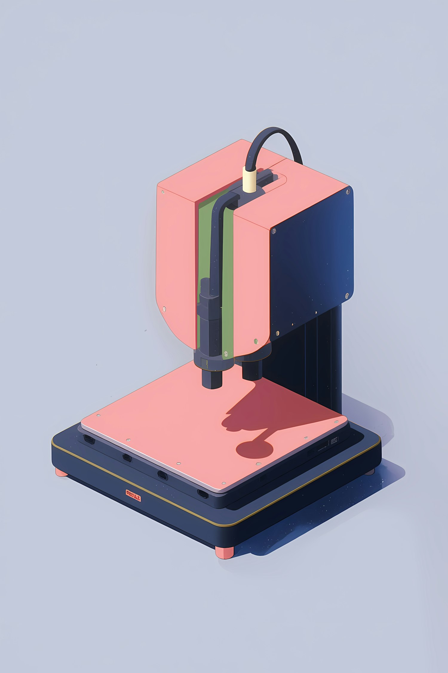A vibrant 3D-rendered machine with a modern design, featuring pink, green, and blue tones, set against a soft gradient background.