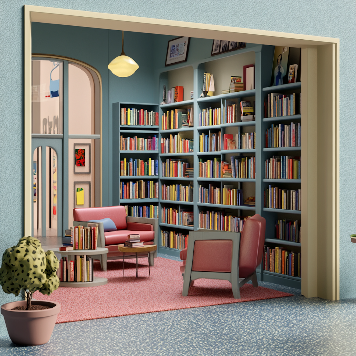 Cozy reading nook with pink armchairs, teal bookshelves, and a warm pendant light. Perfect for book lovers seeking a stylish retreat.