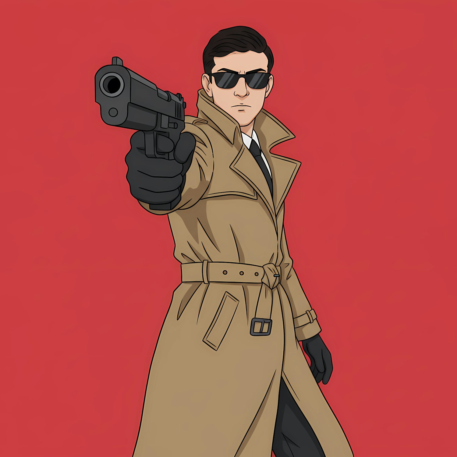 Stylized illustration of a man in a trench coat and sunglasses pointing a handgun, set against a bold red background.