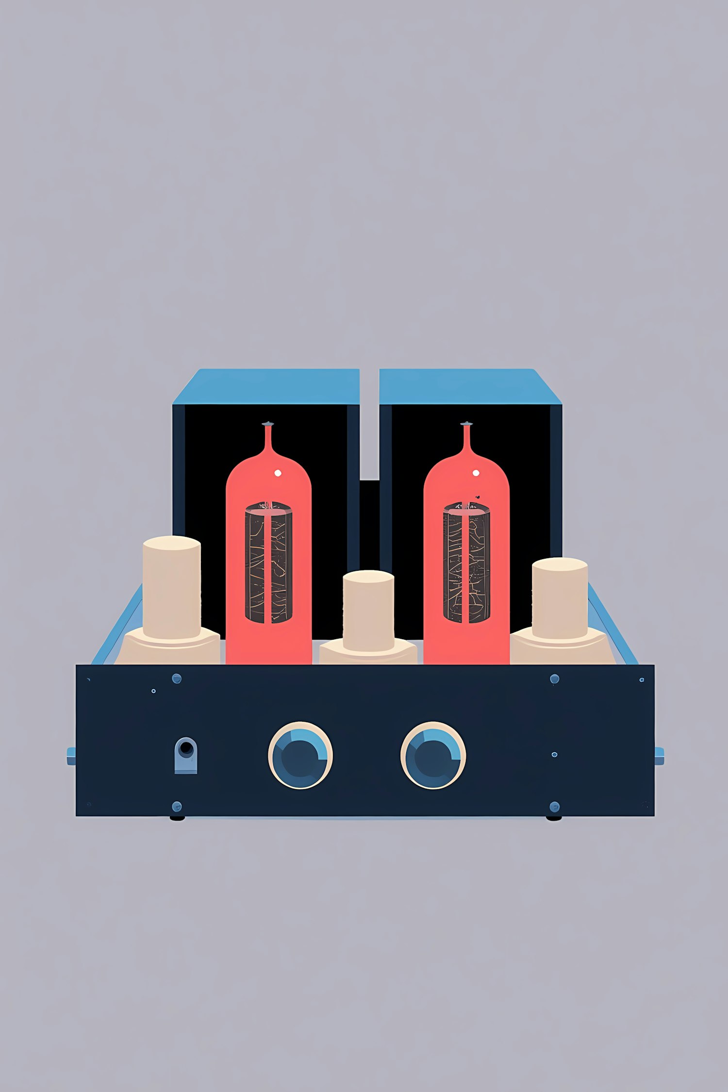 Stylized illustration of a vintage amplifier with red vacuum tubes and a blue chassis, set against a plain gray background.
