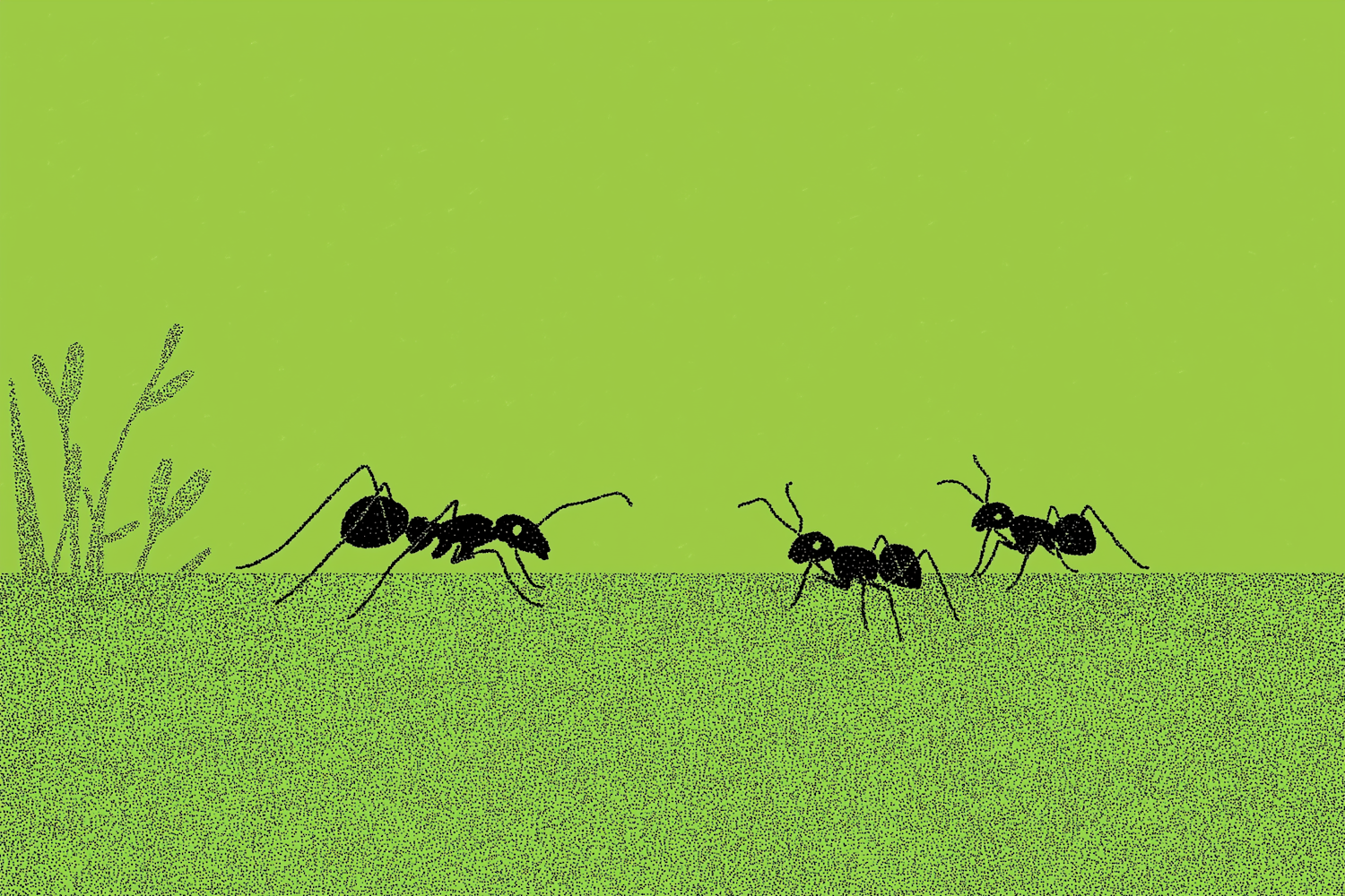 Minimalistic illustration of black ants on a green background, showcasing their detailed forms and a simple natural setting.