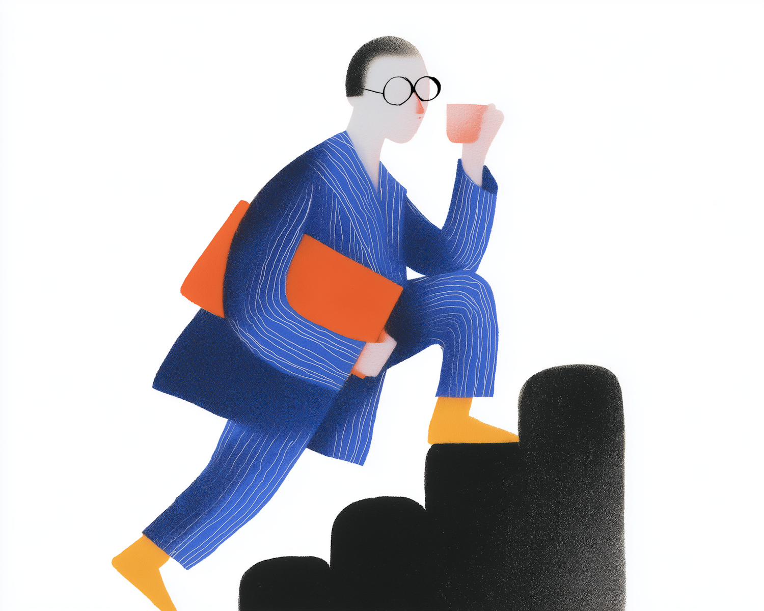 Stylized illustration of a person in a blue suit climbing stairs, holding an orange folder and a pink cup, set against a white background.