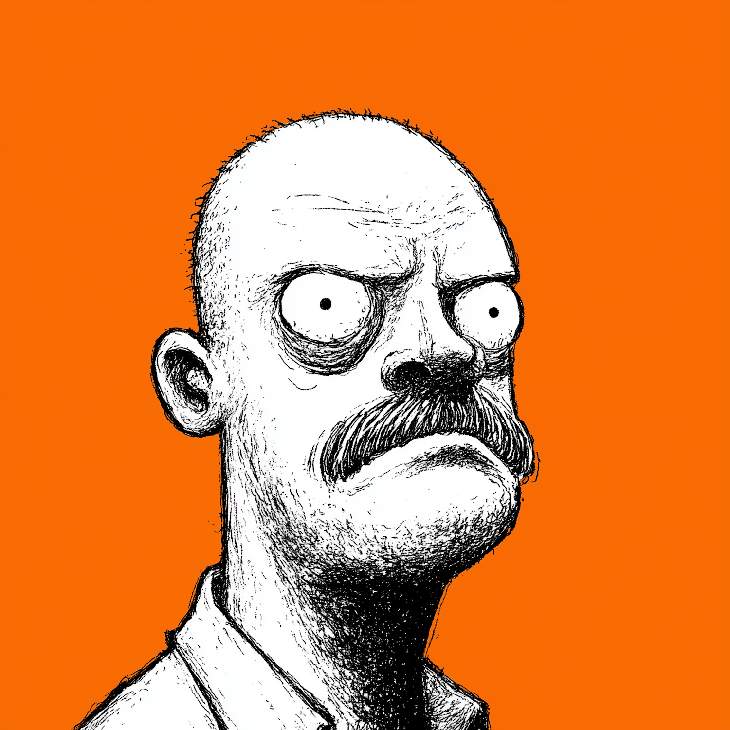 Bold cartoon illustration of a bald man with a mustache and intense expression on a bright orange background.