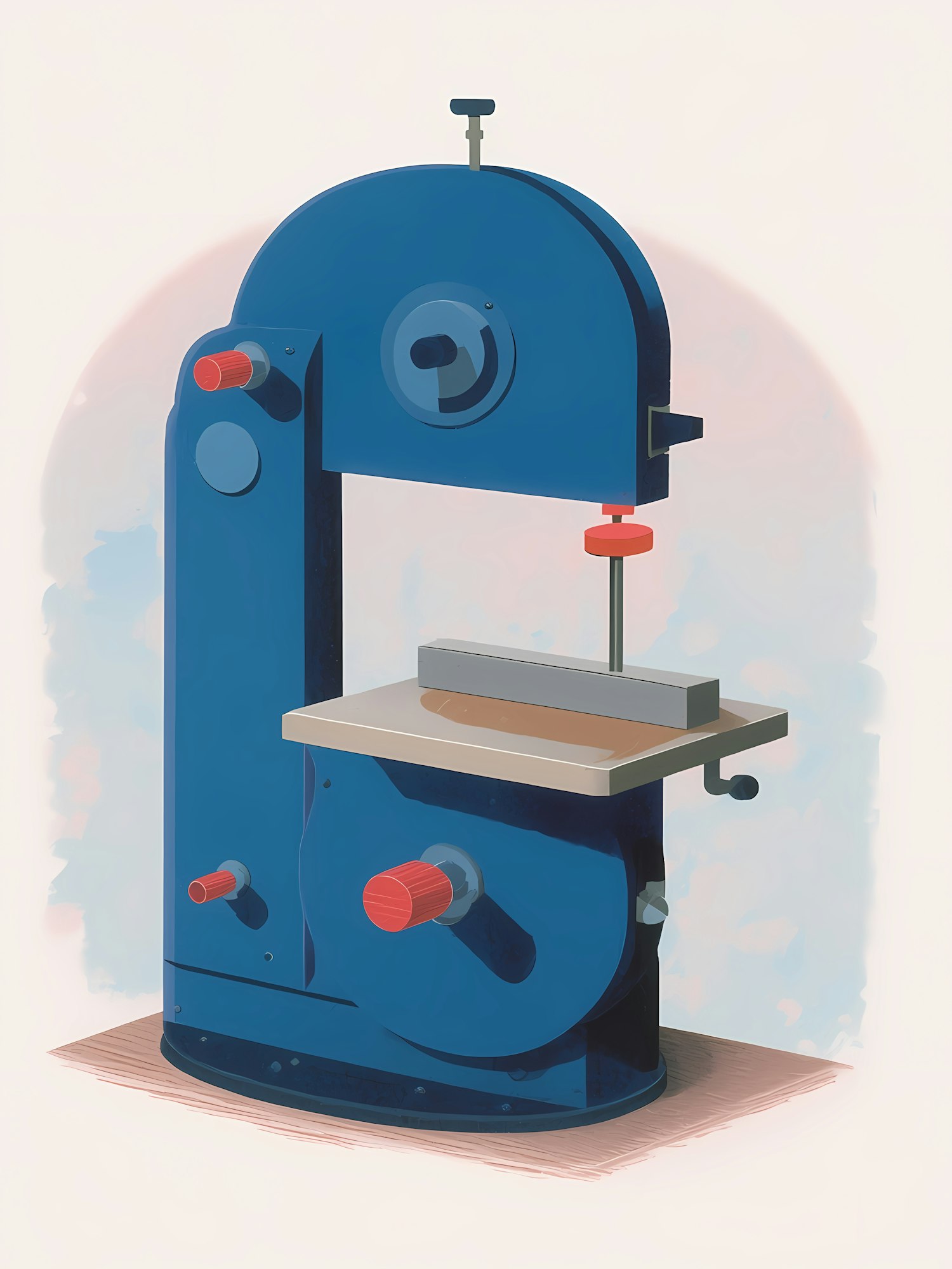 Stylized illustration of a blue bandsaw with red knobs and a metallic table, set against a light gradient background.