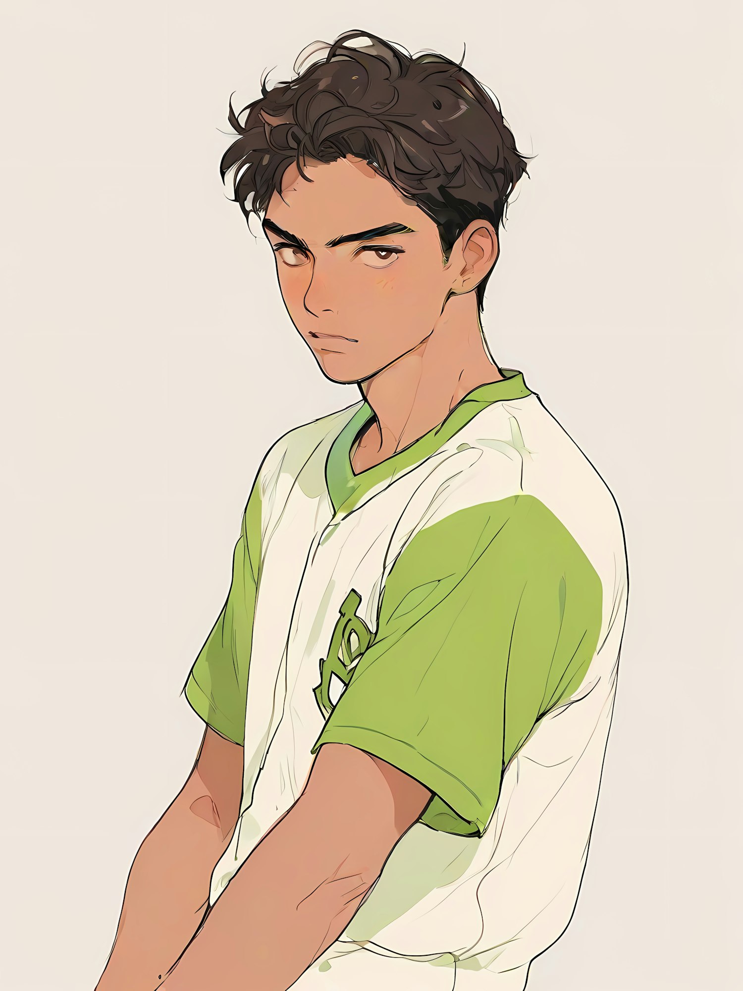 Stylized illustration of a serious young man in a white and green baseball jersey, with wavy dark brown hair and a focused expression.