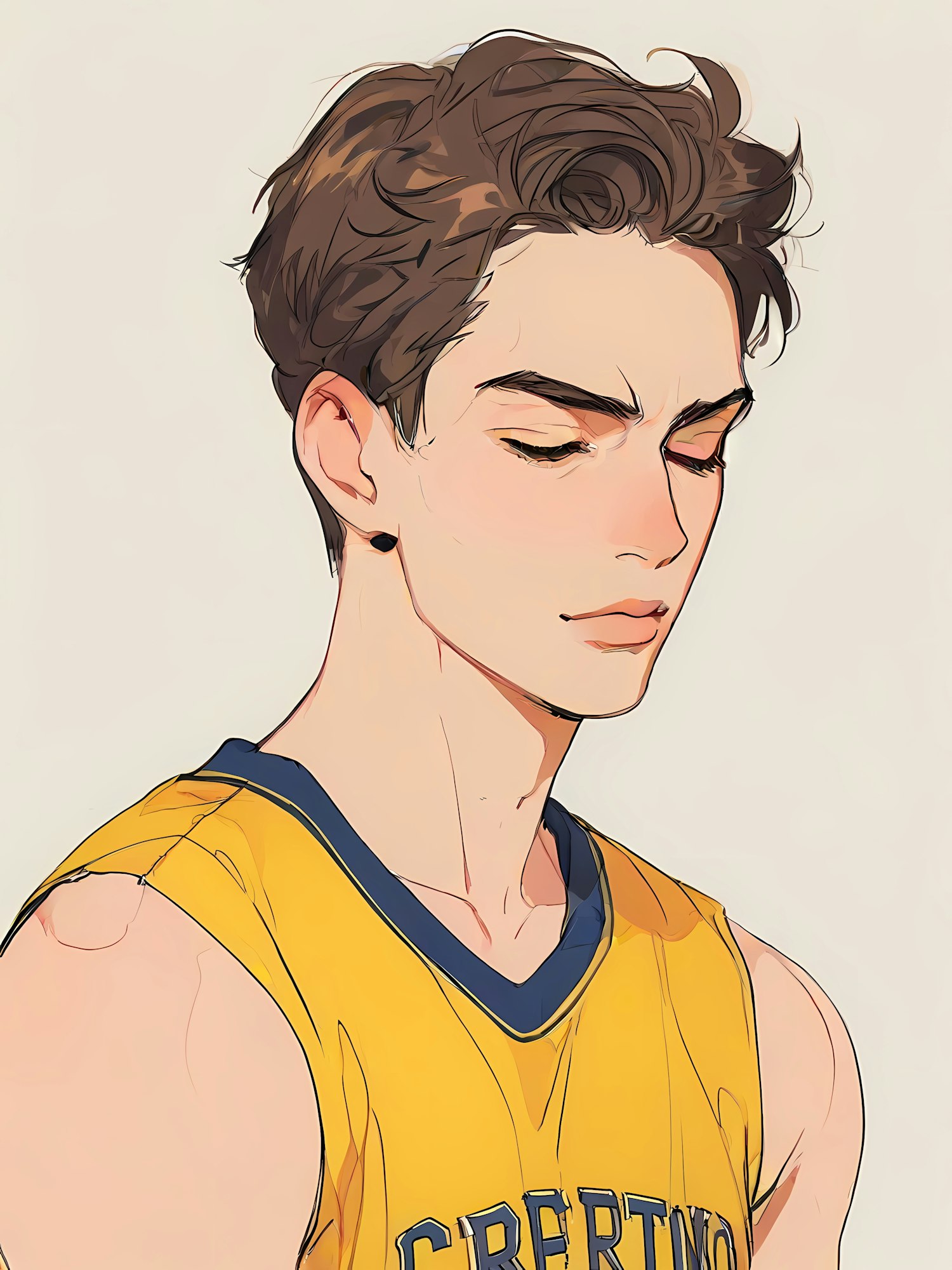 Stylized illustration of a young man in a yellow basketball jersey, eyes closed, with wavy brown hair and a contemplative expression.