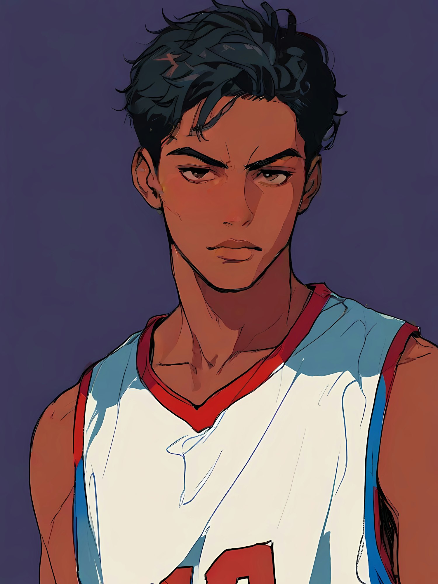 Stylized illustration of a serious young man in a basketball jersey, set against a dark purple background. Bold and modern art style.