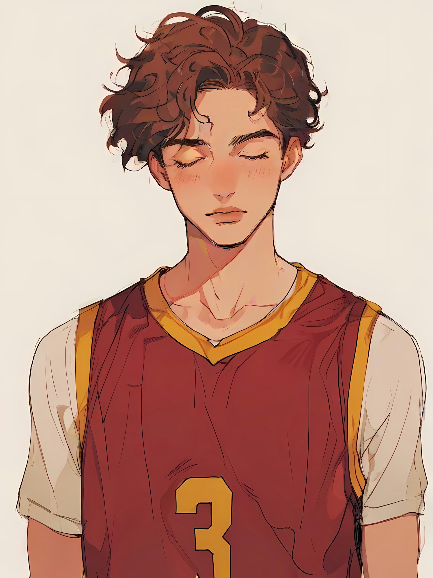 Illustration of a young man with wavy brown hair in a maroon basketball jersey, eyes closed, calm expression, and soft painterly art style.