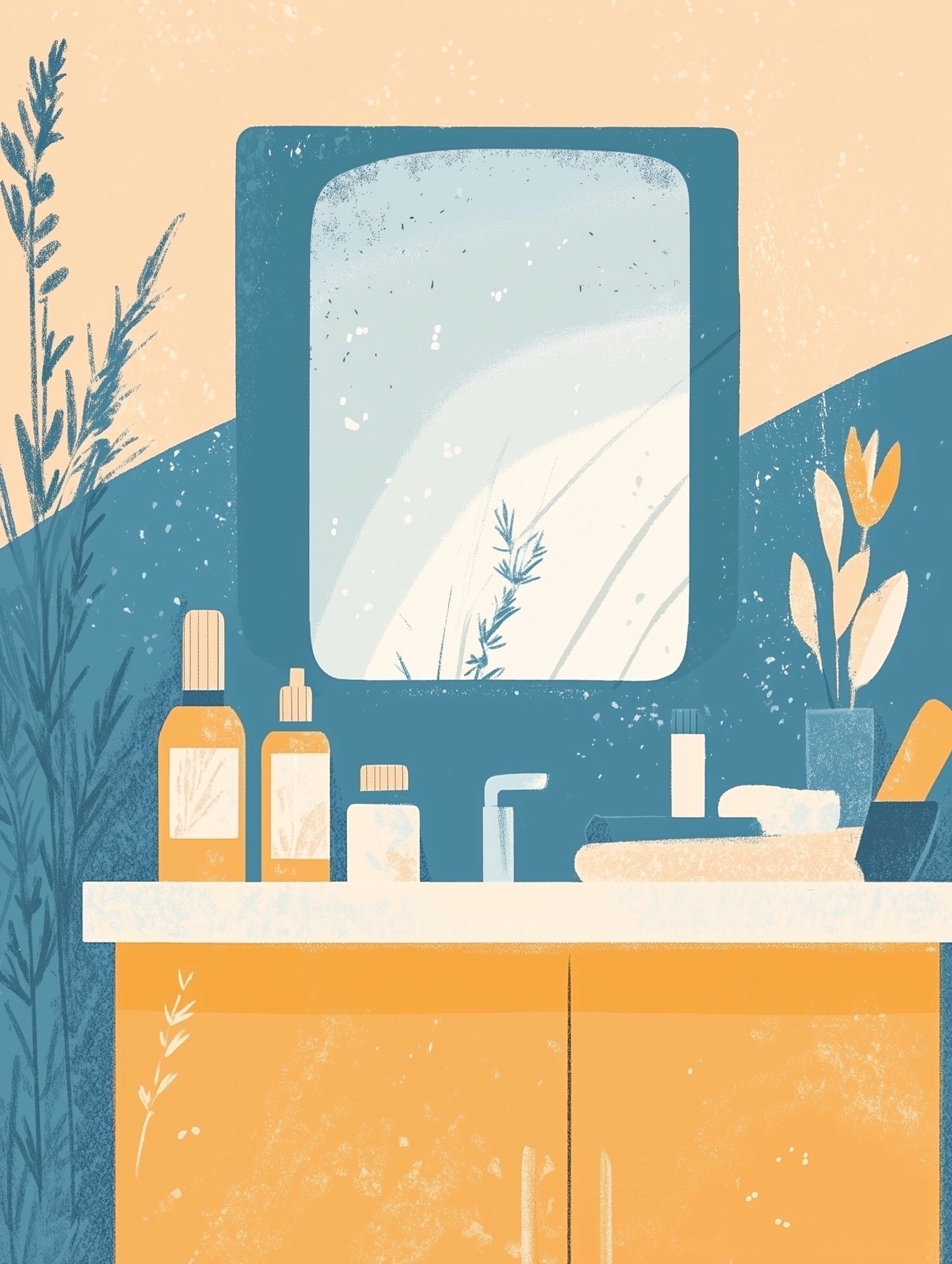 Stylized bathroom scene with toiletries, a mirror, and plants in soft blue and yellow tones.