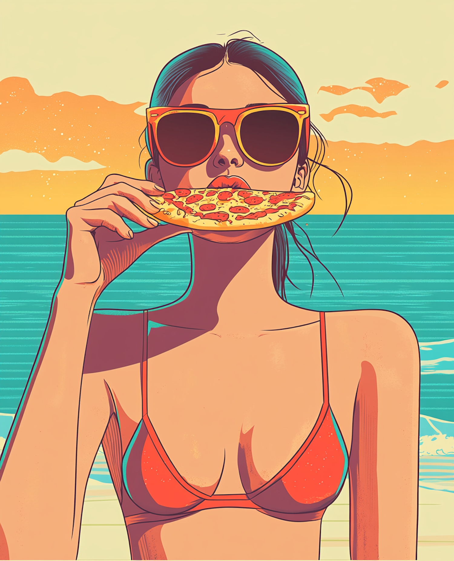 Stylized illustration of a woman in a red bikini eating pizza at the beach, with orange sunglasses and a vibrant sunset backdrop.