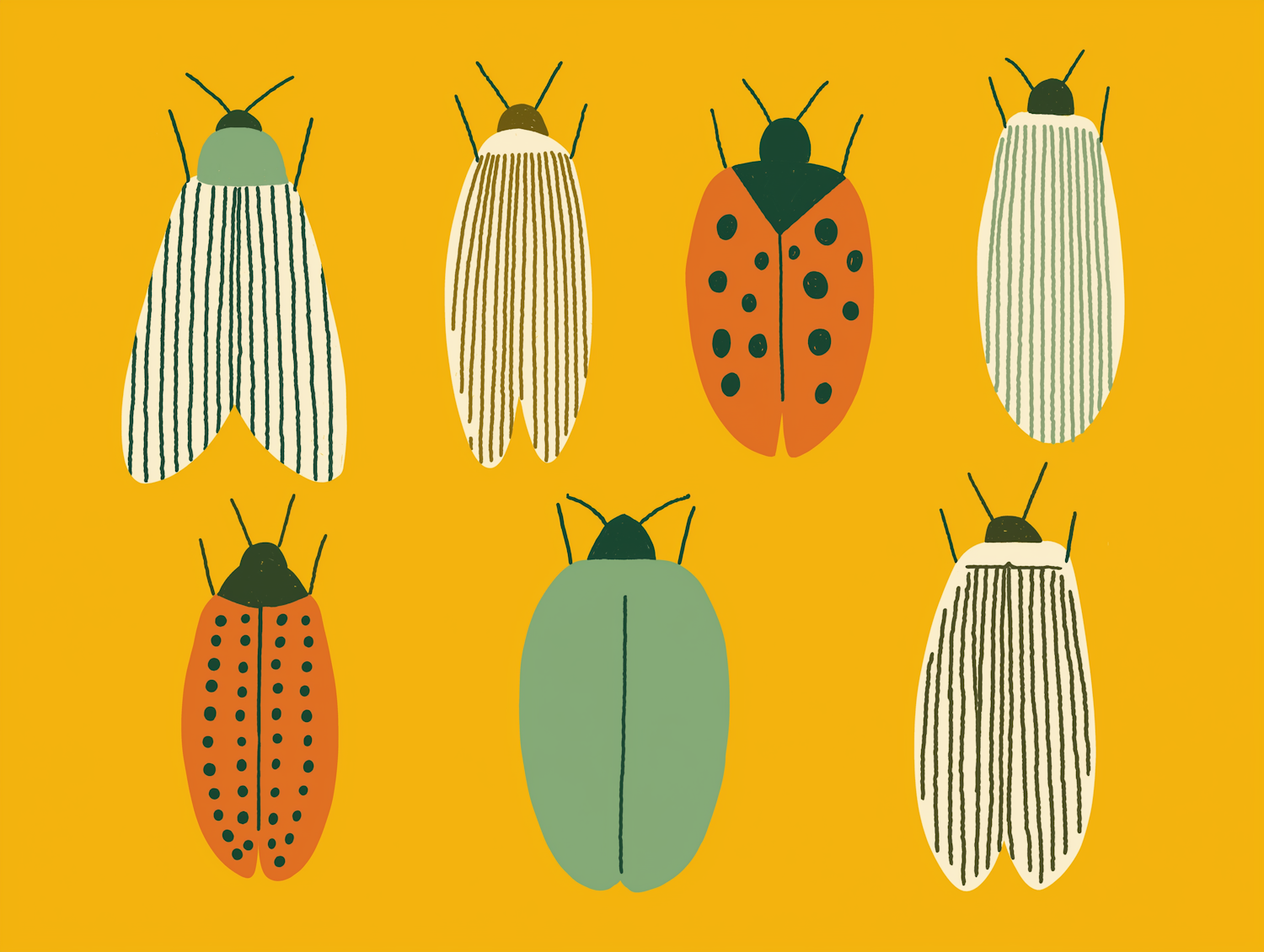 Bright illustration of colorful beetles with unique patterns on a yellow background, perfect for nature or art enthusiasts.