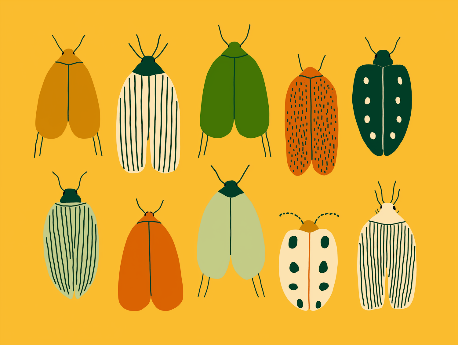 A vibrant illustration of colorful beetles with unique patterns on a yellow background, perfect for nature or design enthusiasts.