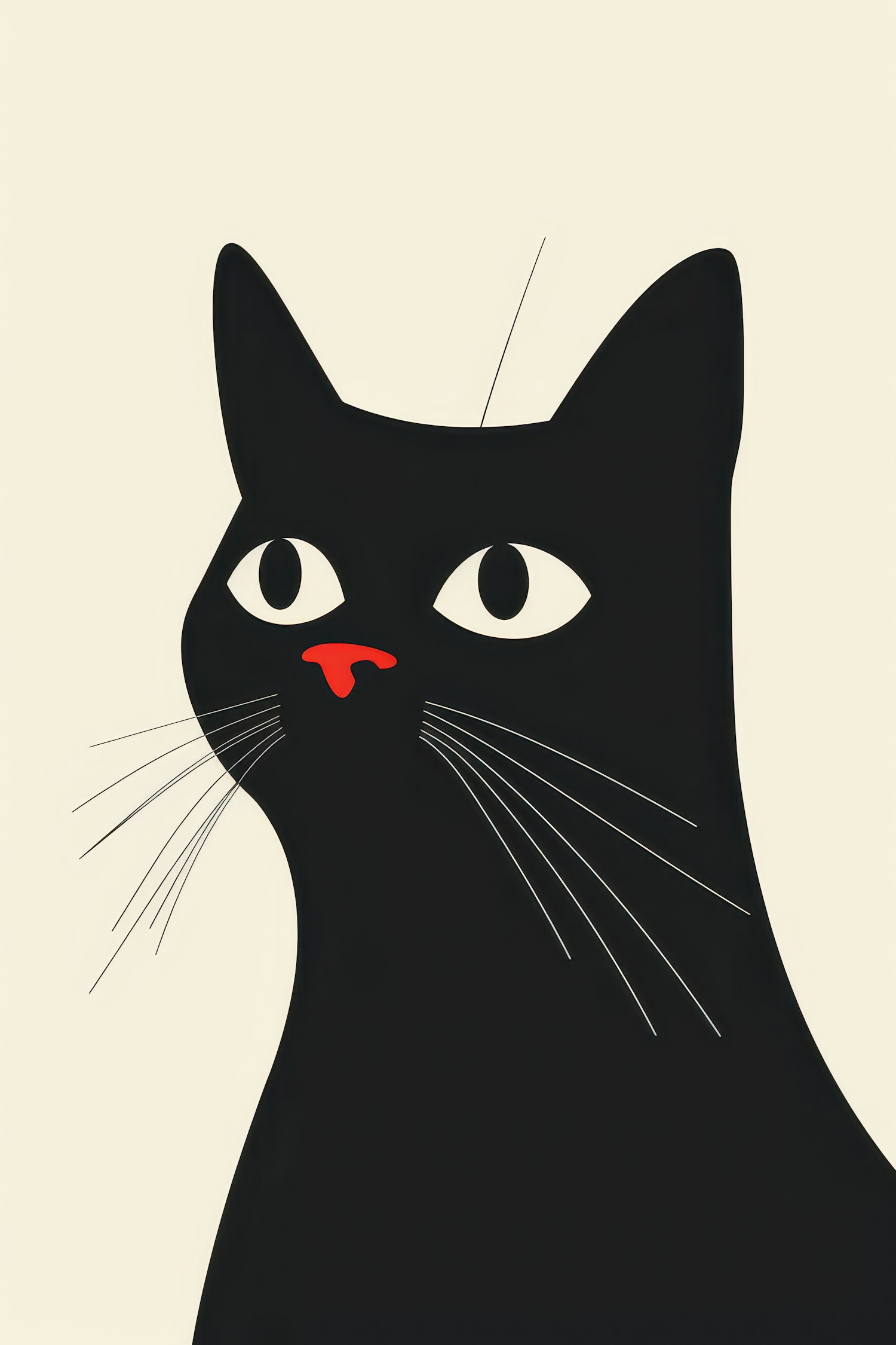 Minimalist black cat illustration with bold shapes, white eyes, red nose, and cream background for a modern, sleek design.
