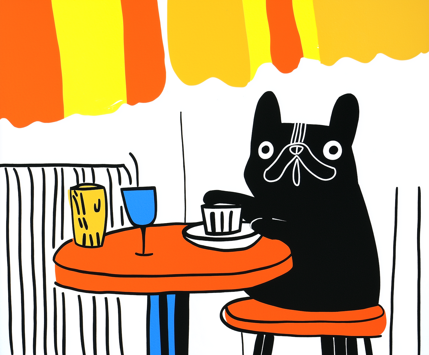Whimsical illustration of a black cartoon dog at an orange table with colorful glasses and a vibrant background.