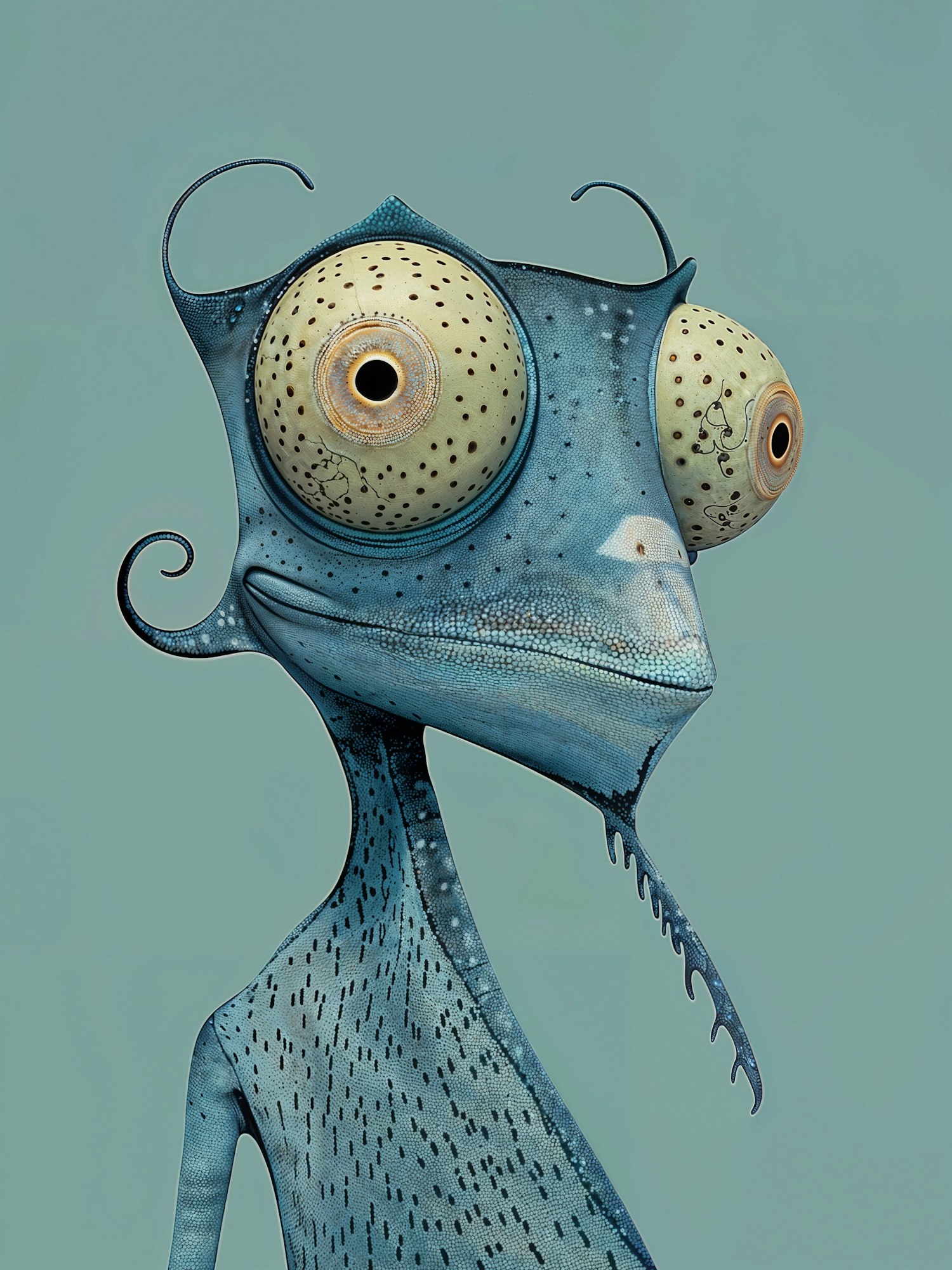 A quirky blue chameleon-like creature with large, speckled eyes and intricate textures, set against a muted teal background.