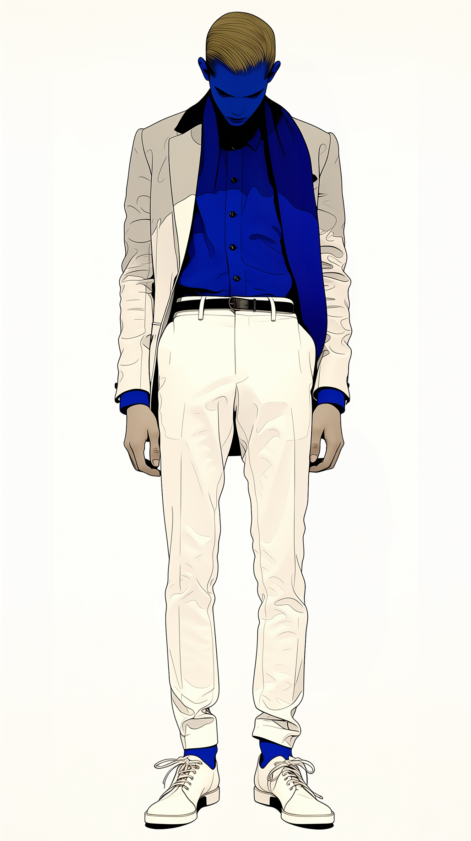 Stylized illustration of a person in a white suit and blue shirt, with a striking blue face and hands, set against a minimalistic background.