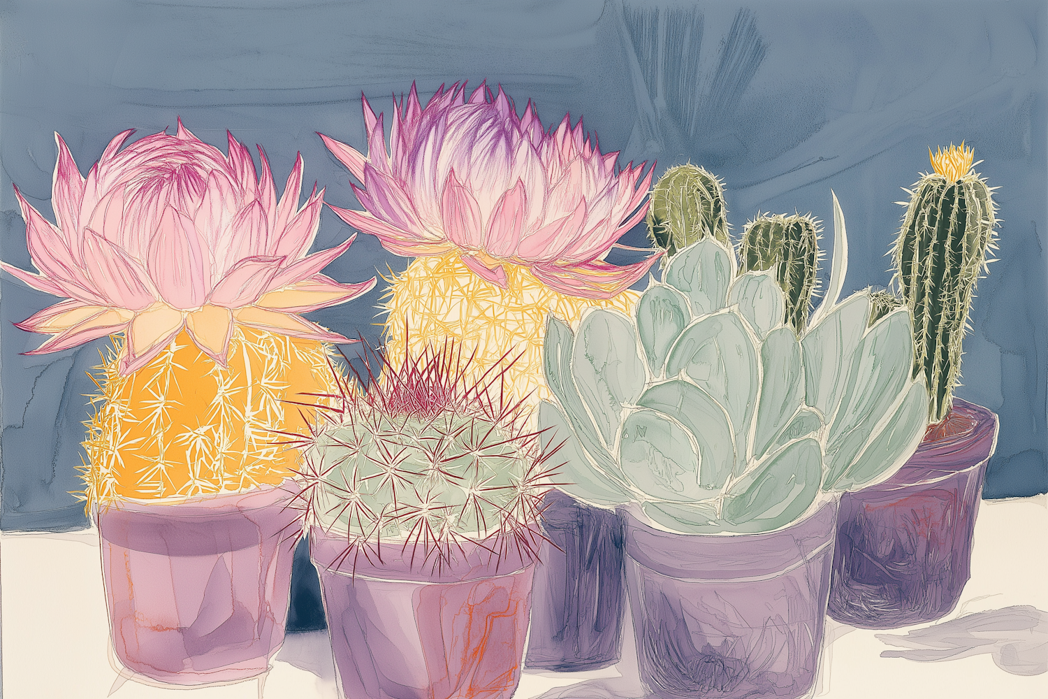 Colorful illustration of blooming cacti and succulents in purple pots against a blue background, showcasing vibrant pink flowers.