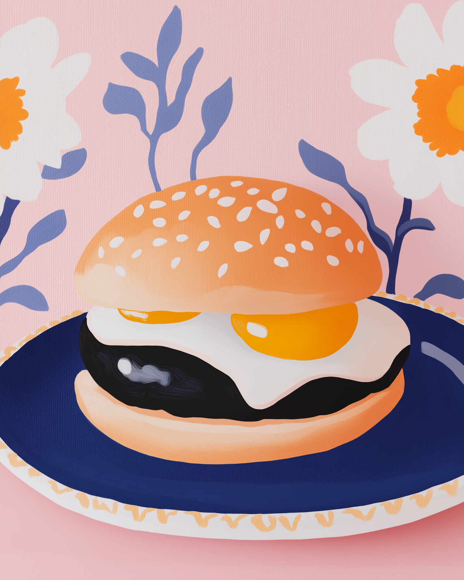 Whimsical burger illustration with a sunny-side-up egg on a blue plate, set against a pink floral background.