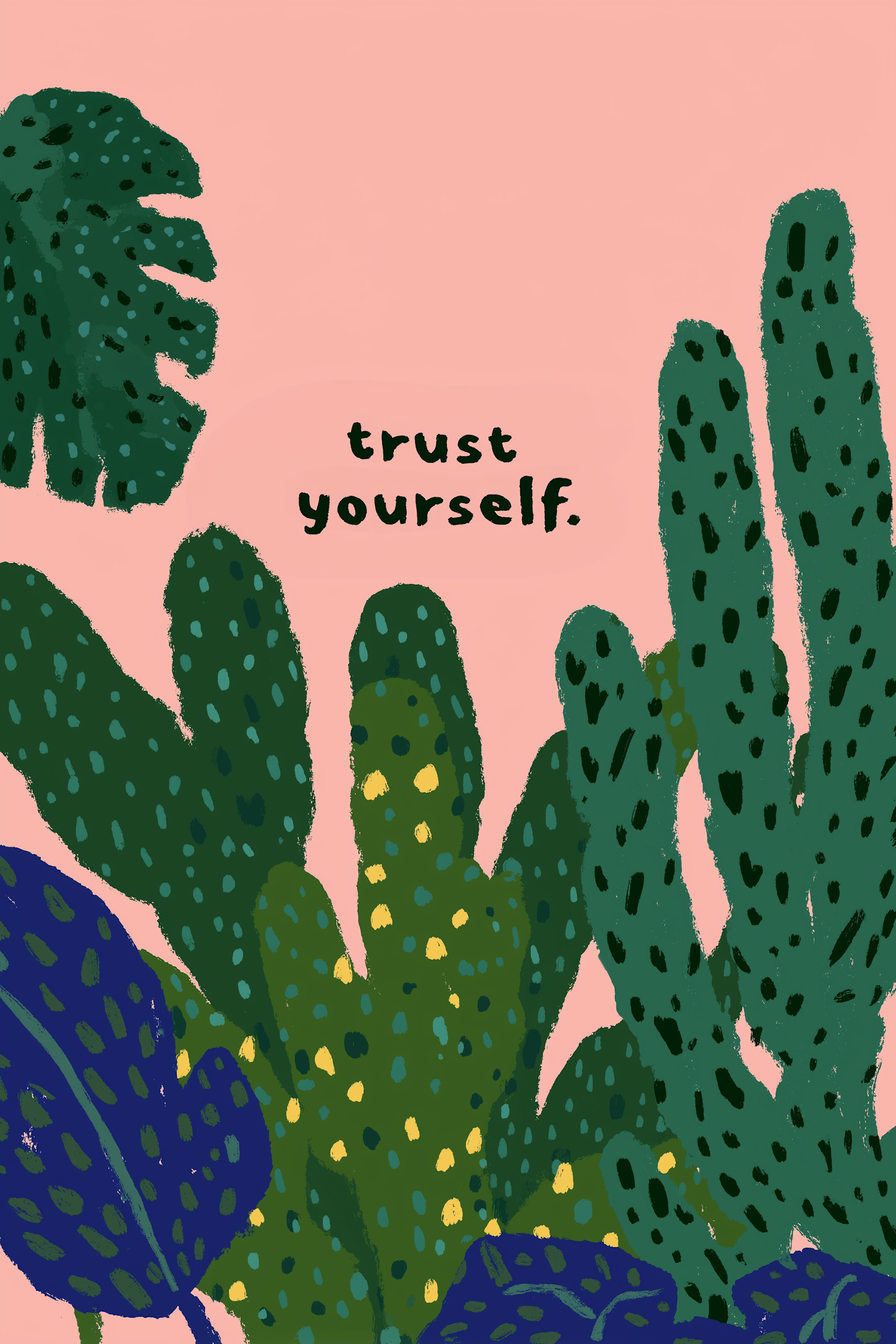 Colorful illustration of cacti with the motivational phrase 'trust yourself' on a pink background. Perfect for inspiration and decor.