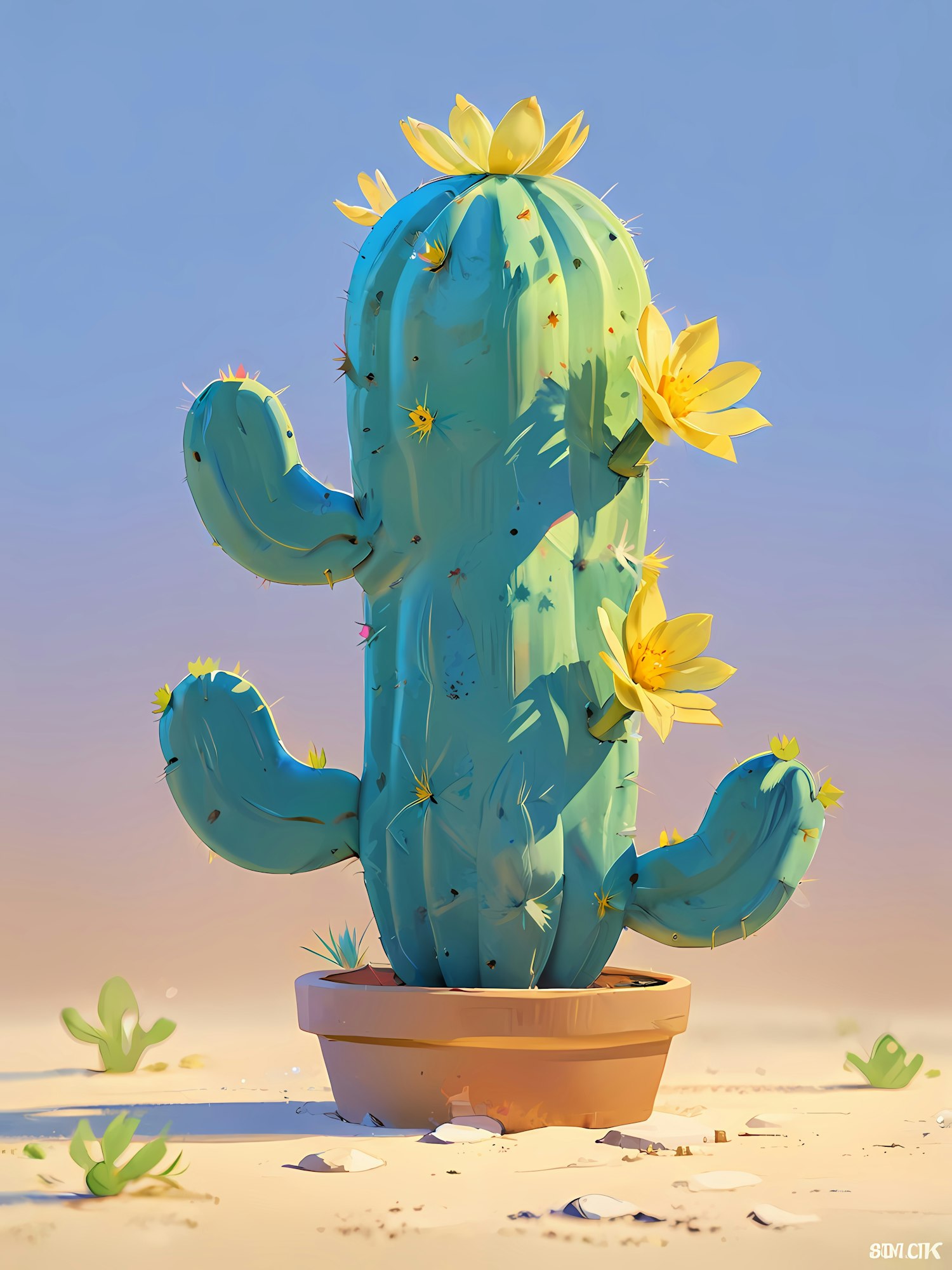 Whimsical illustration of a potted cactus with yellow flowers, set against a desert-inspired background. Bright and playful design.