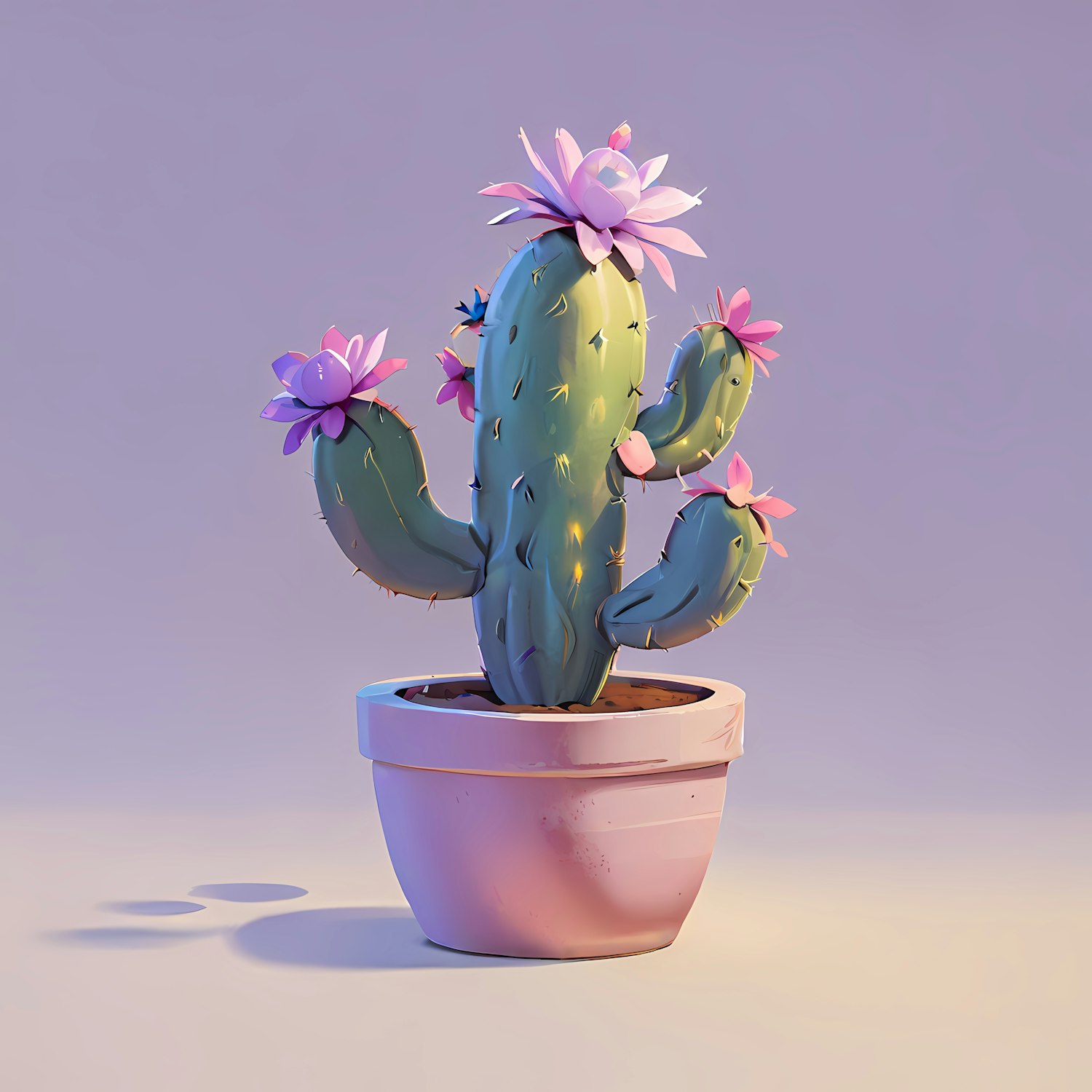 Stylized 3D cactus with pink flowers in a soft pink pot against a light purple background.