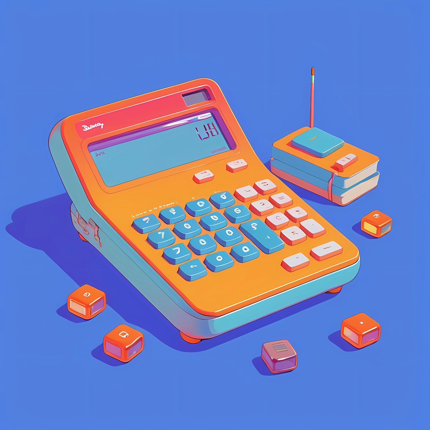 Colorful retro calculator illustration with vibrant orange and blue hues, surrounded by playful cubes and books, set on a blue background.