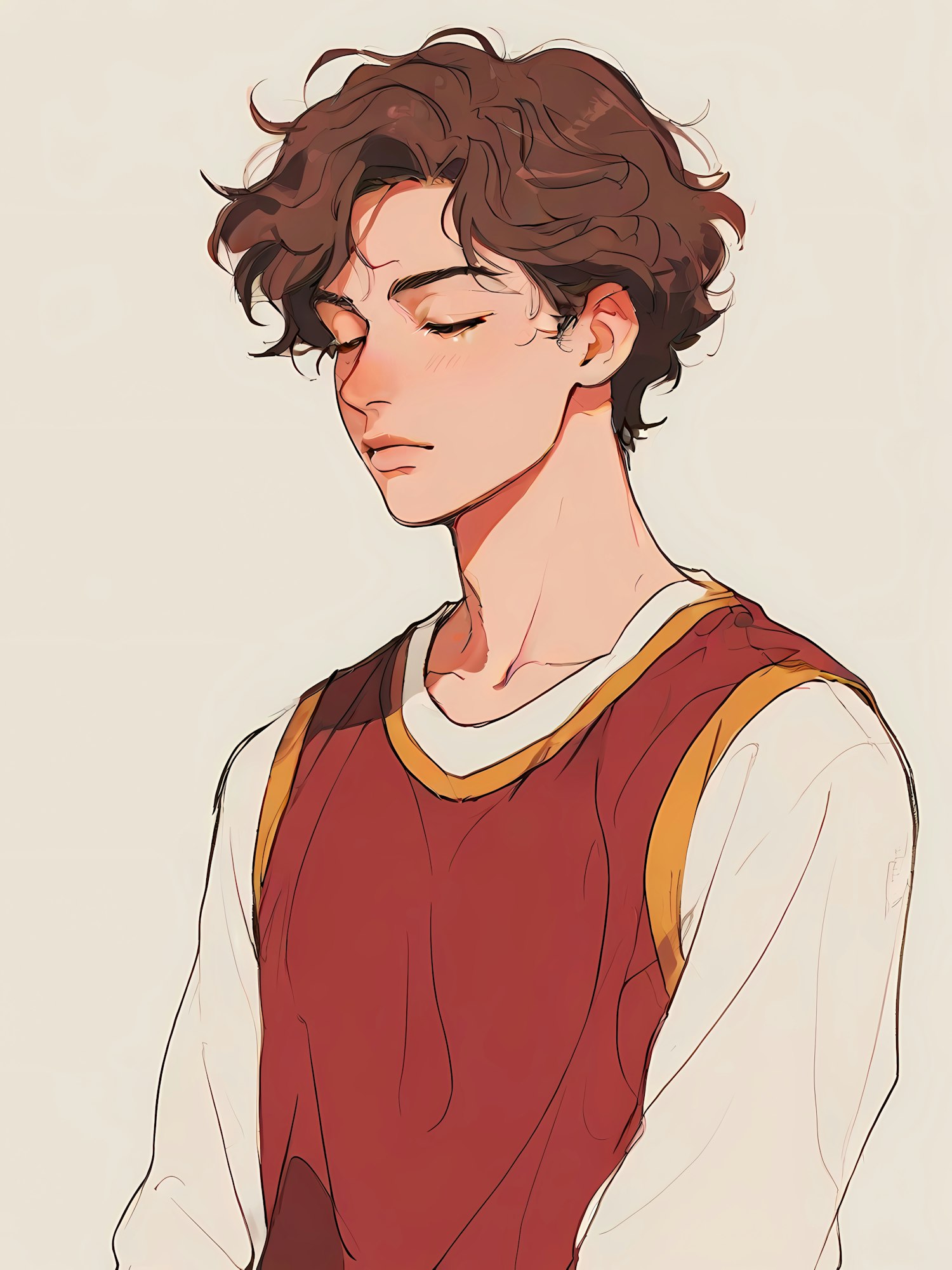 Stylized illustration of a young man with wavy brown hair, wearing a red jersey over a white shirt, eyes closed in a calm, reflective pose.