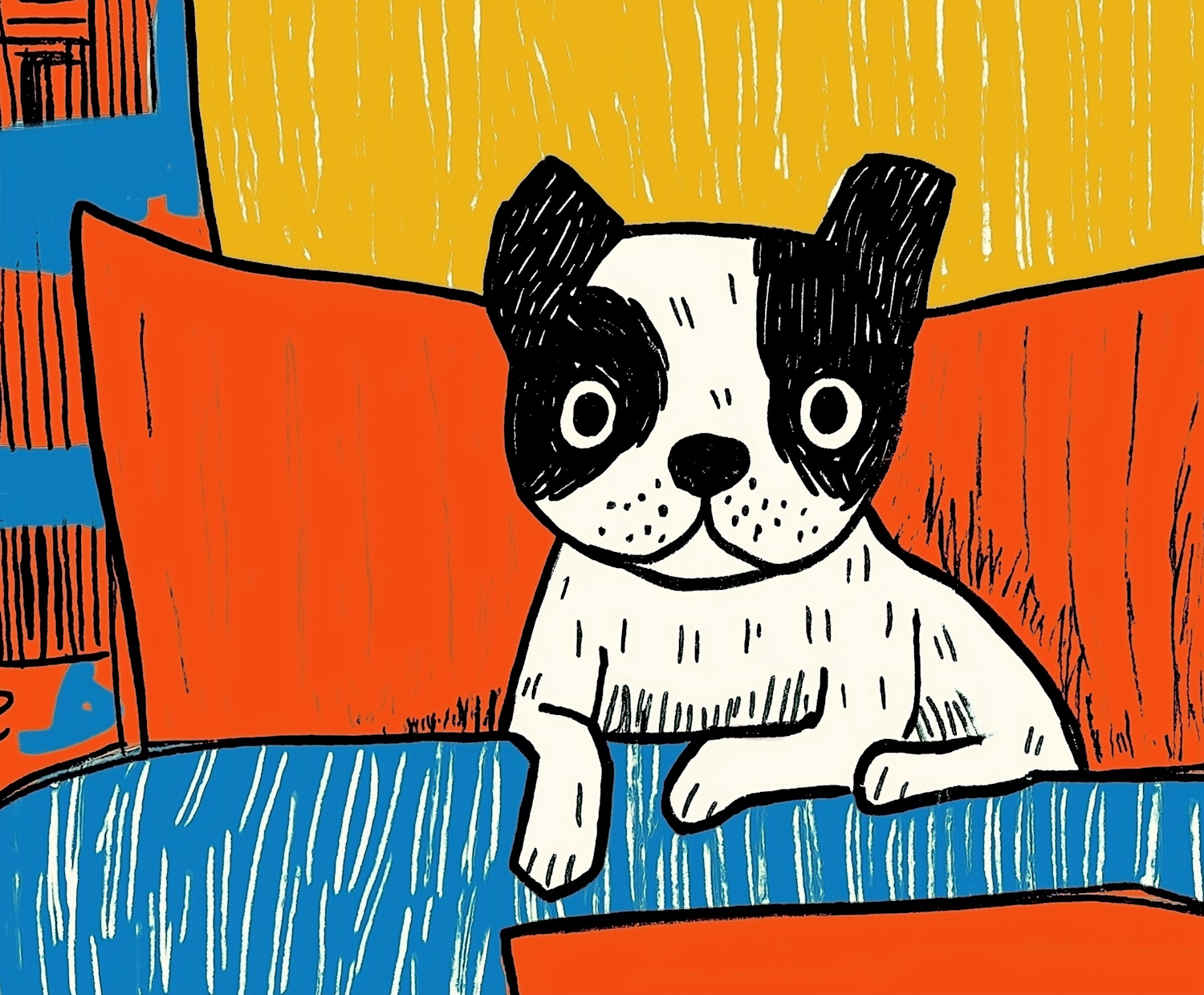 Colorful illustration of a cute dog with black patches, set against a vibrant orange, yellow, and blue background.