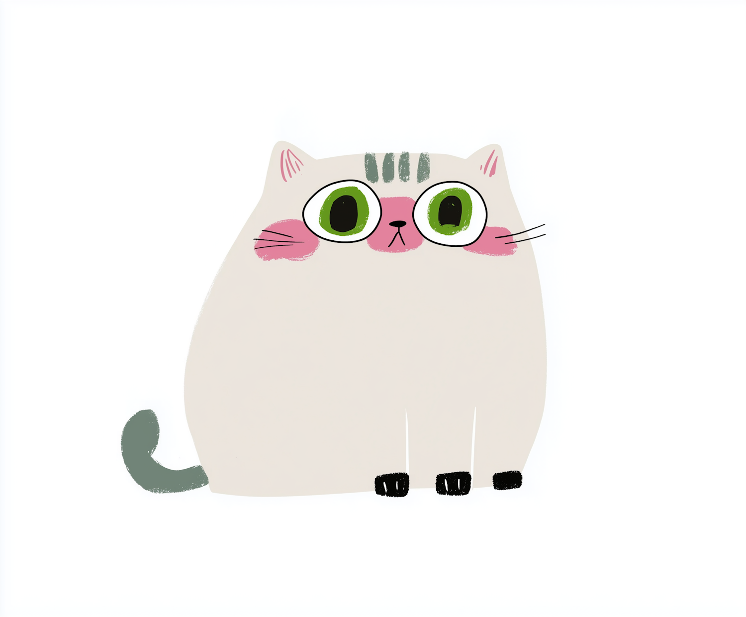 Cute cartoon cat with big green eyes, pink cheeks, and a beige body on a white background. Whimsical and playful illustration.