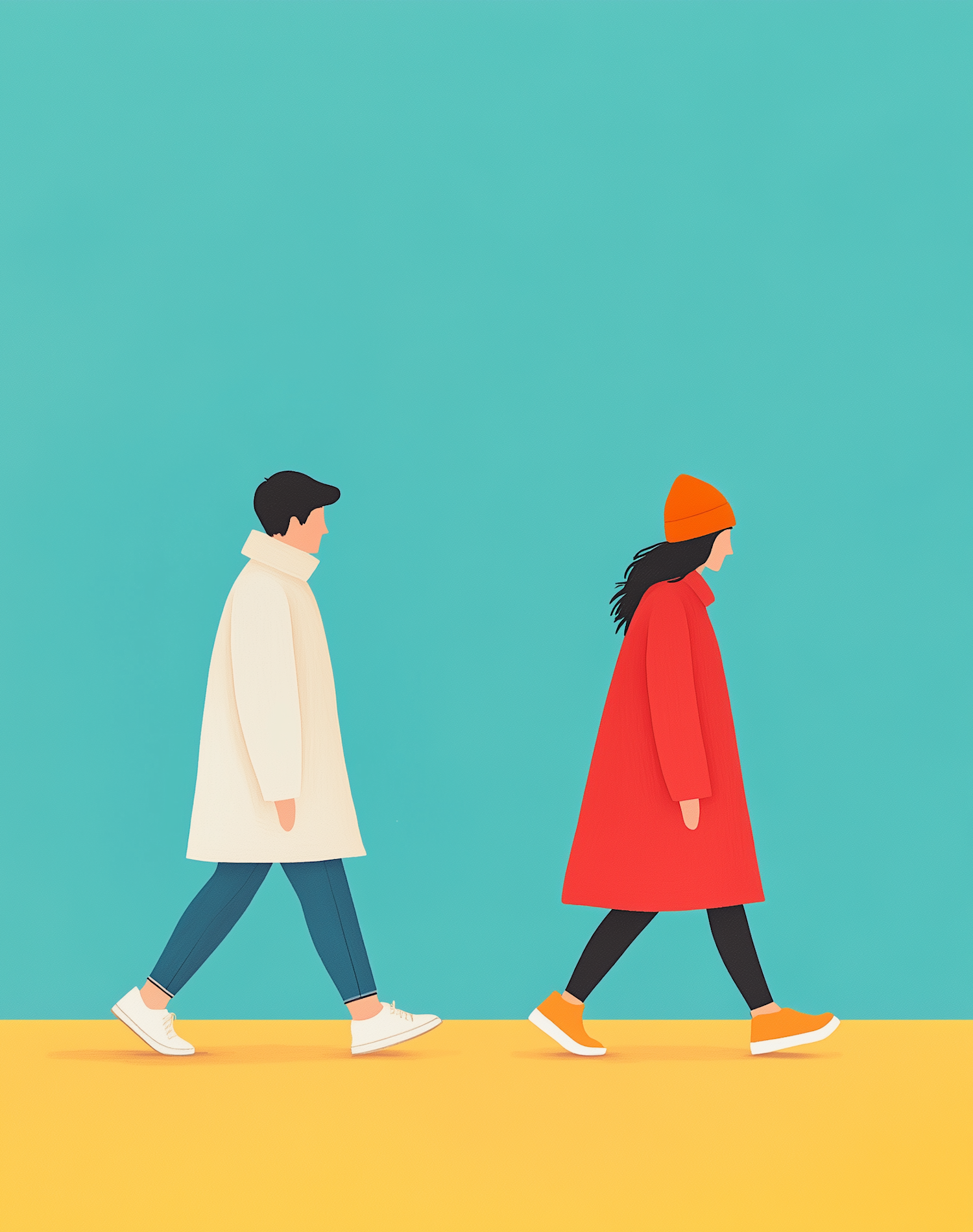 Minimalist illustration of two people walking, one in a white coat and the other in a red coat, against a teal and yellow background.