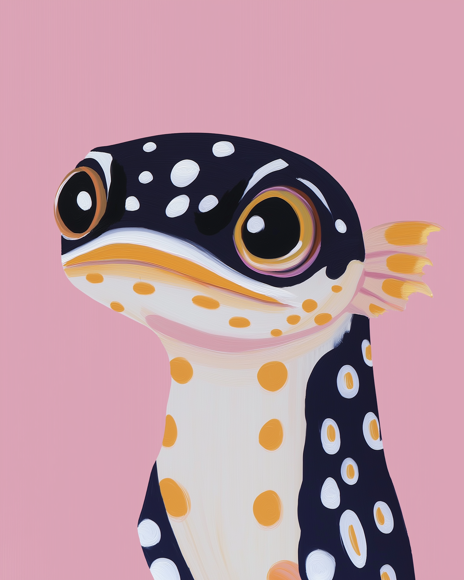 Whimsical fish illustration with bold spots and expressive eyes on a pastel pink background, creating a playful and vibrant scene.