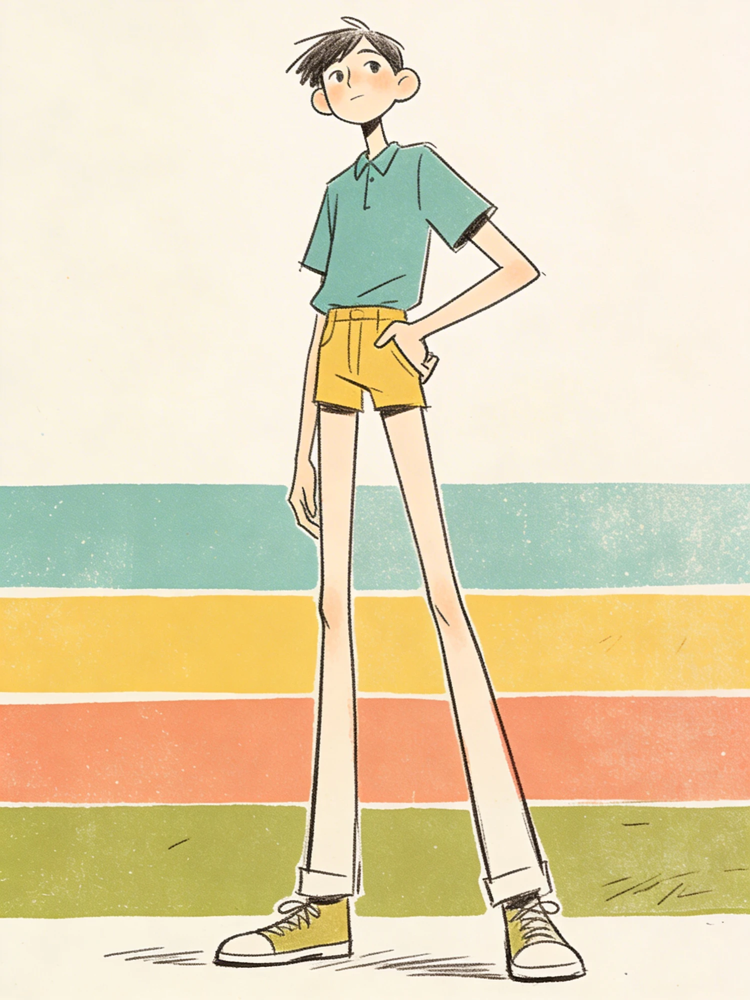 Stylized illustration of a tall character in casual attire, set against a pastel-striped background, showcasing a whimsical art style.