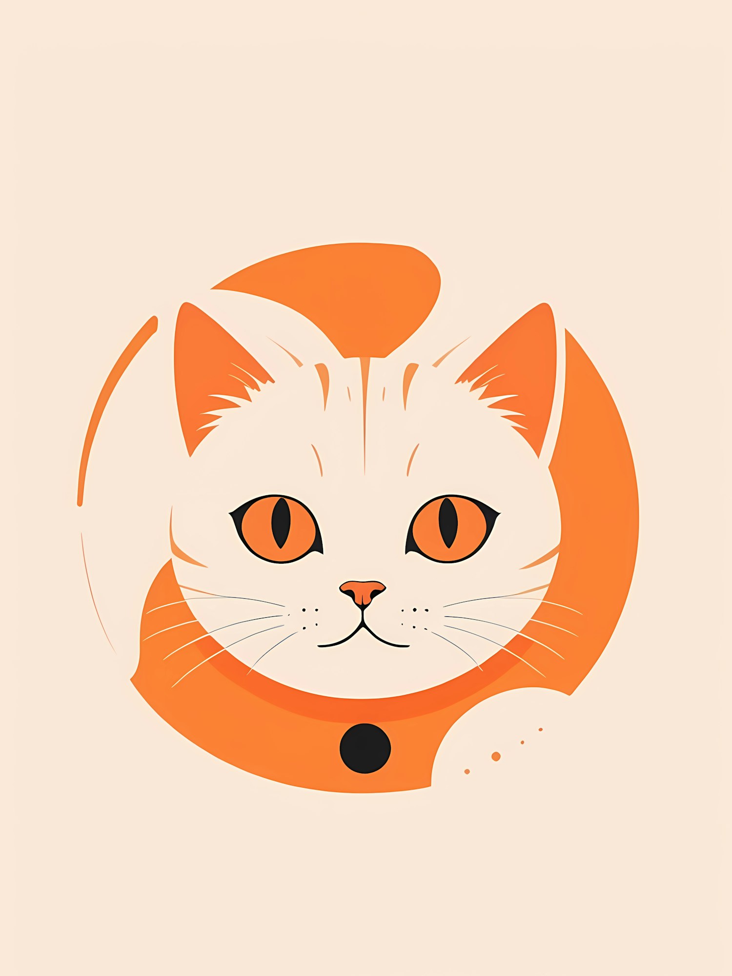 Minimalist cat illustration with orange accents on a beige background, featuring a modern and symmetrical design.