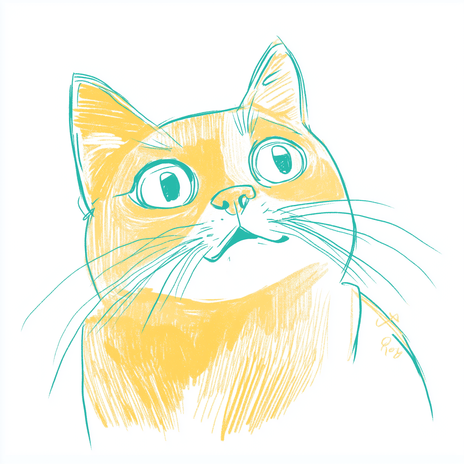 Whimsical cat illustration with bright yellow-orange coat and teal outlines, featuring wide eyes and a curious expression.