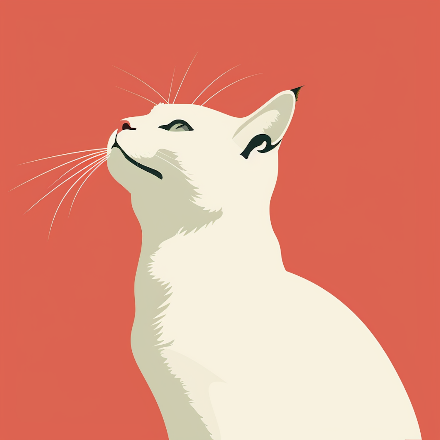 Minimalist illustration of a white cat in profile against a coral background, featuring clean lines and a serene expression.