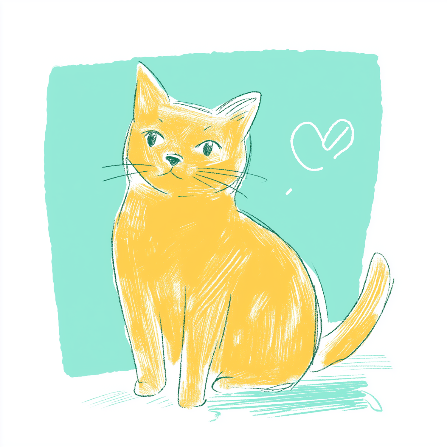 Charming illustration of a yellow cat with a heart, set against a teal background. Playful and affectionate vibe.