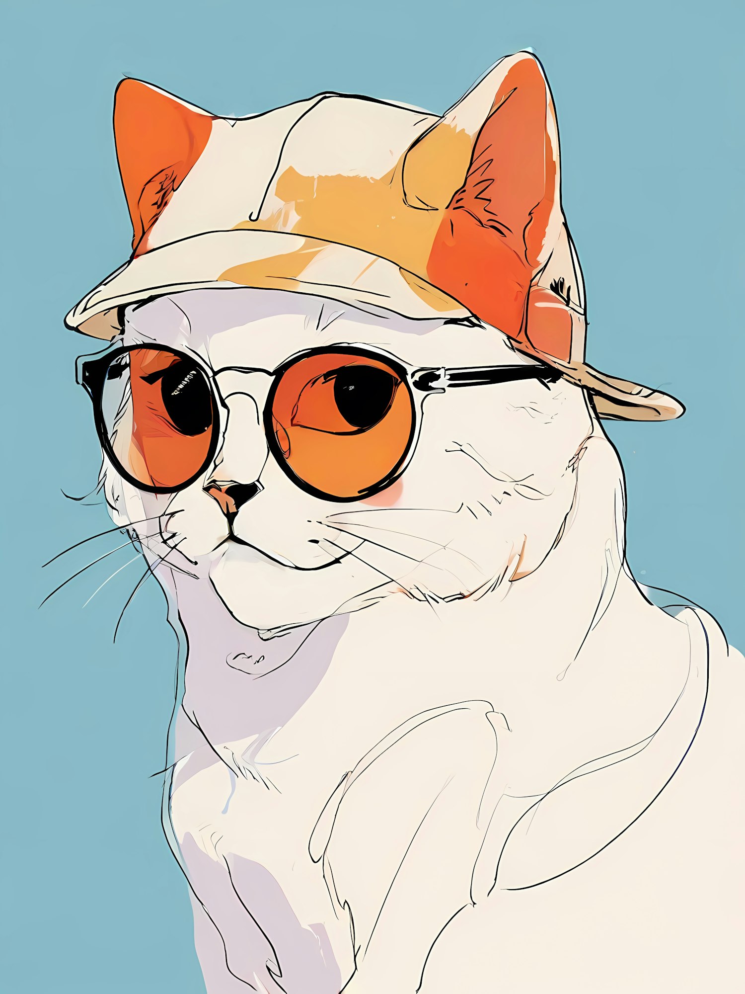 Trendy cat illustration with a bucket hat and orange sunglasses on a blue background. Modern and stylish design.