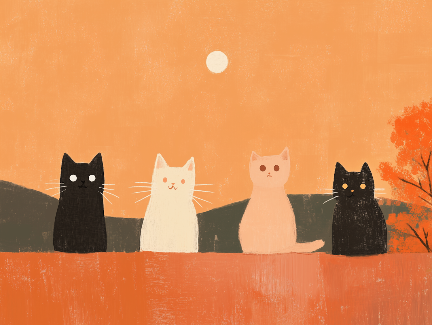 Charming illustration of four cartoon cats in a warm, orange landscape with a whimsical autumn feel.