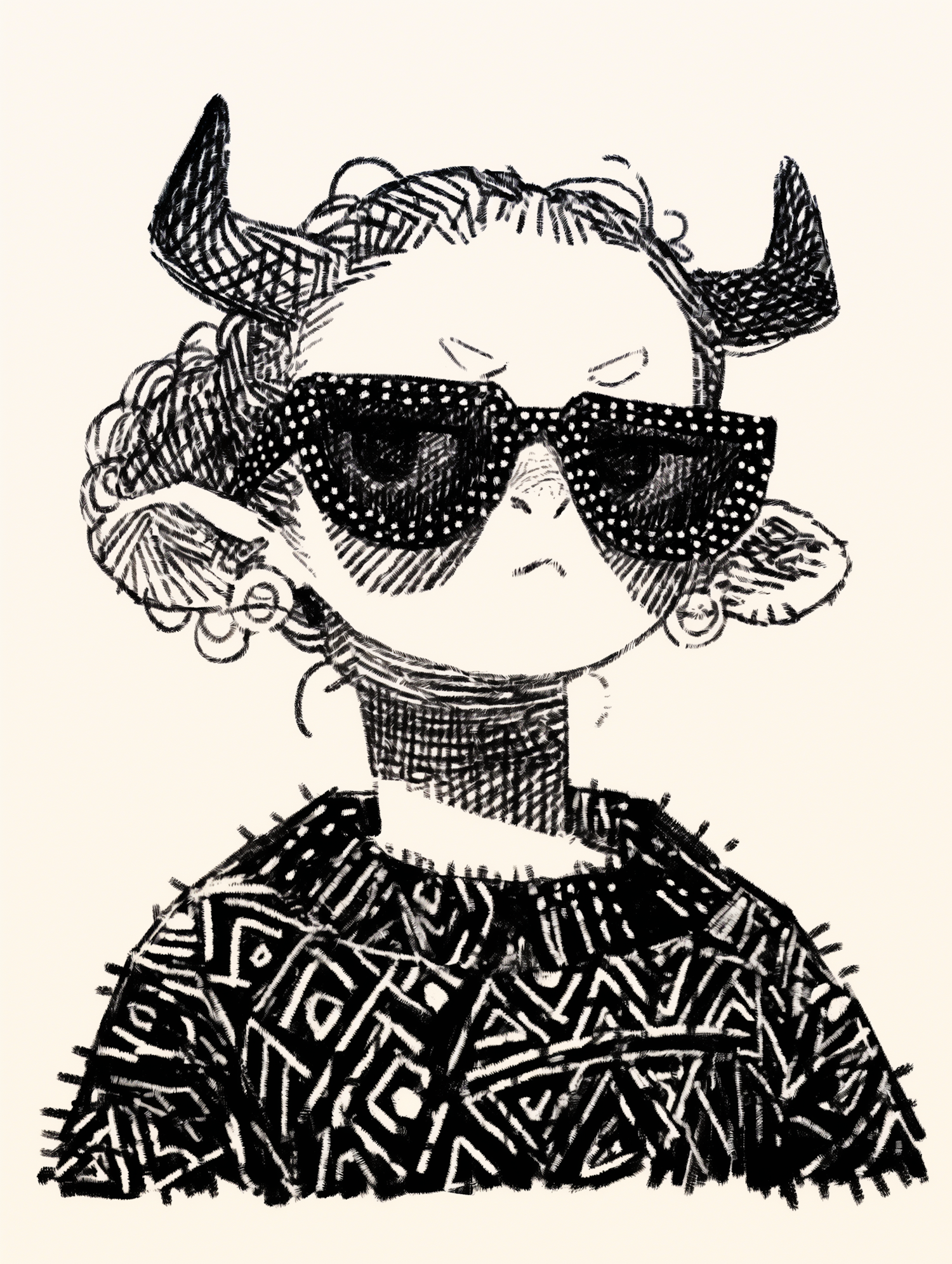 Stylized black-and-white illustration of a horned character with sunglasses and a patterned top, showcasing a bold and artistic design.