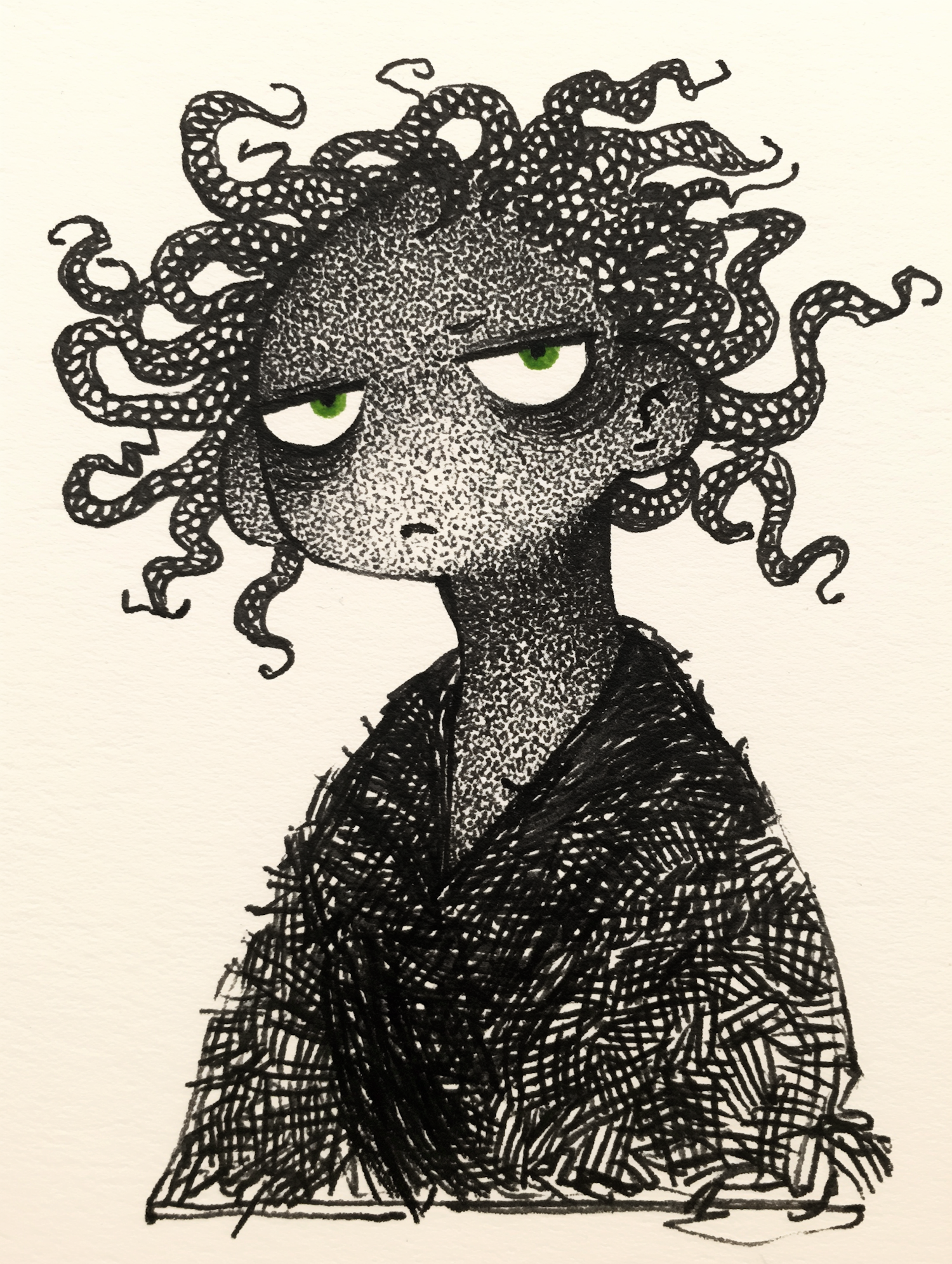 Stylized illustration of a character with textured features, curly hair, and striking green eyes, set against a plain background.