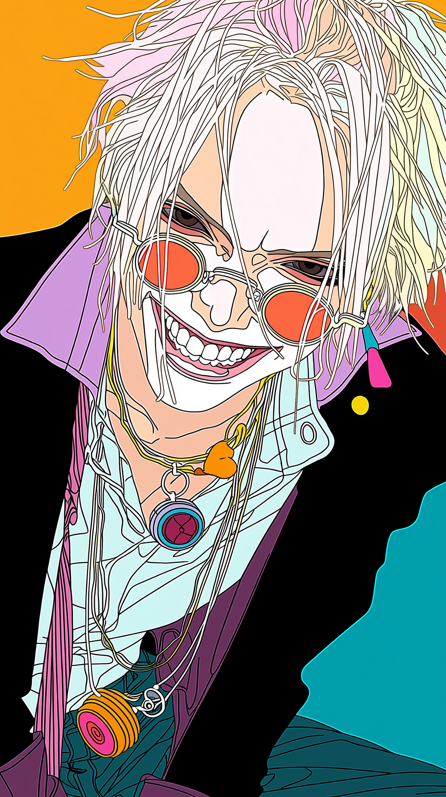 Stylized illustration of a vibrant character with colorful attire, red-tinted glasses, and a dynamic pose against a bold background.
