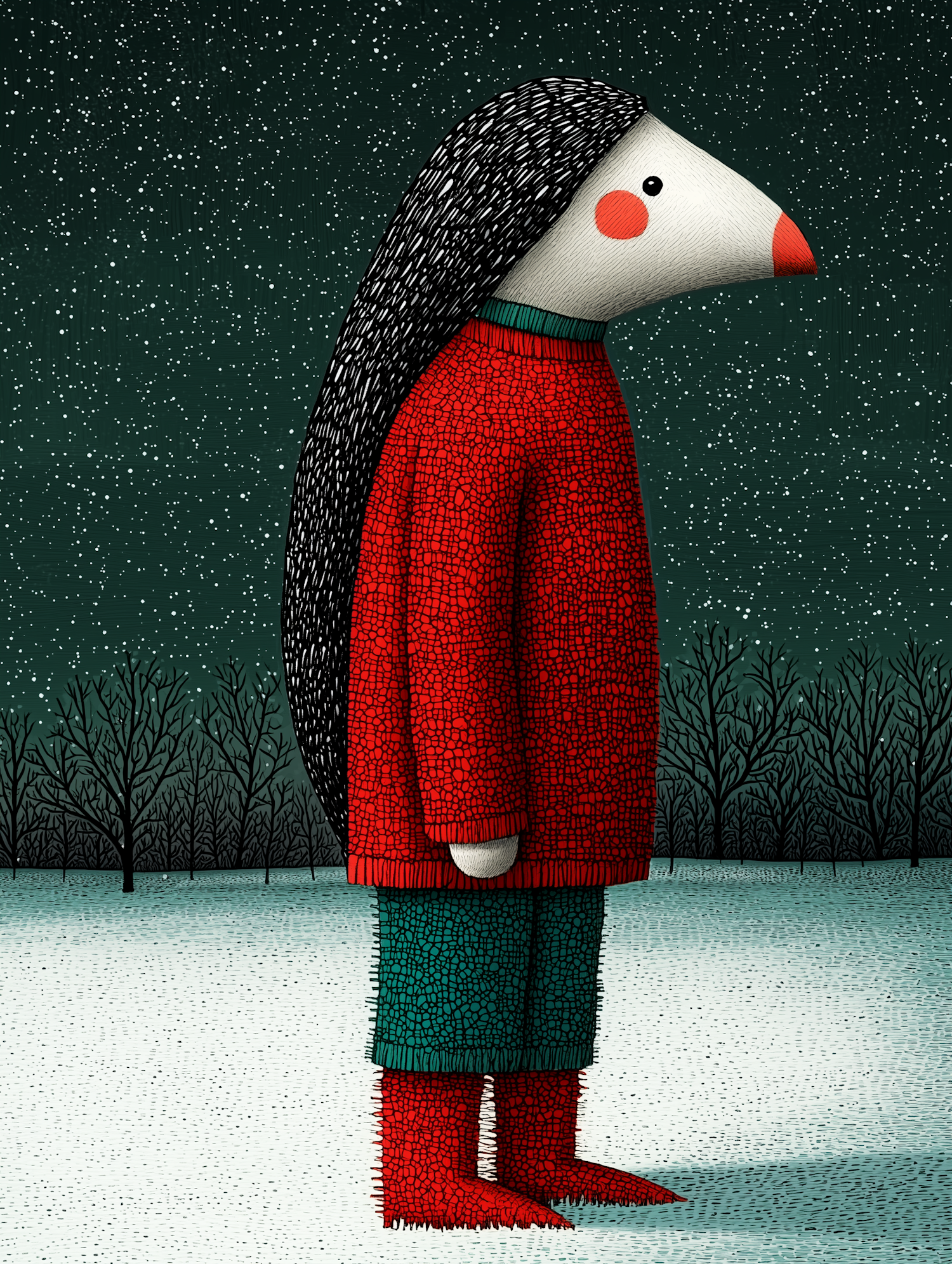 Whimsical character with a long face and red nose in a snowy landscape, wearing a red outfit and boots. Snowflakes fill the dark green sky.