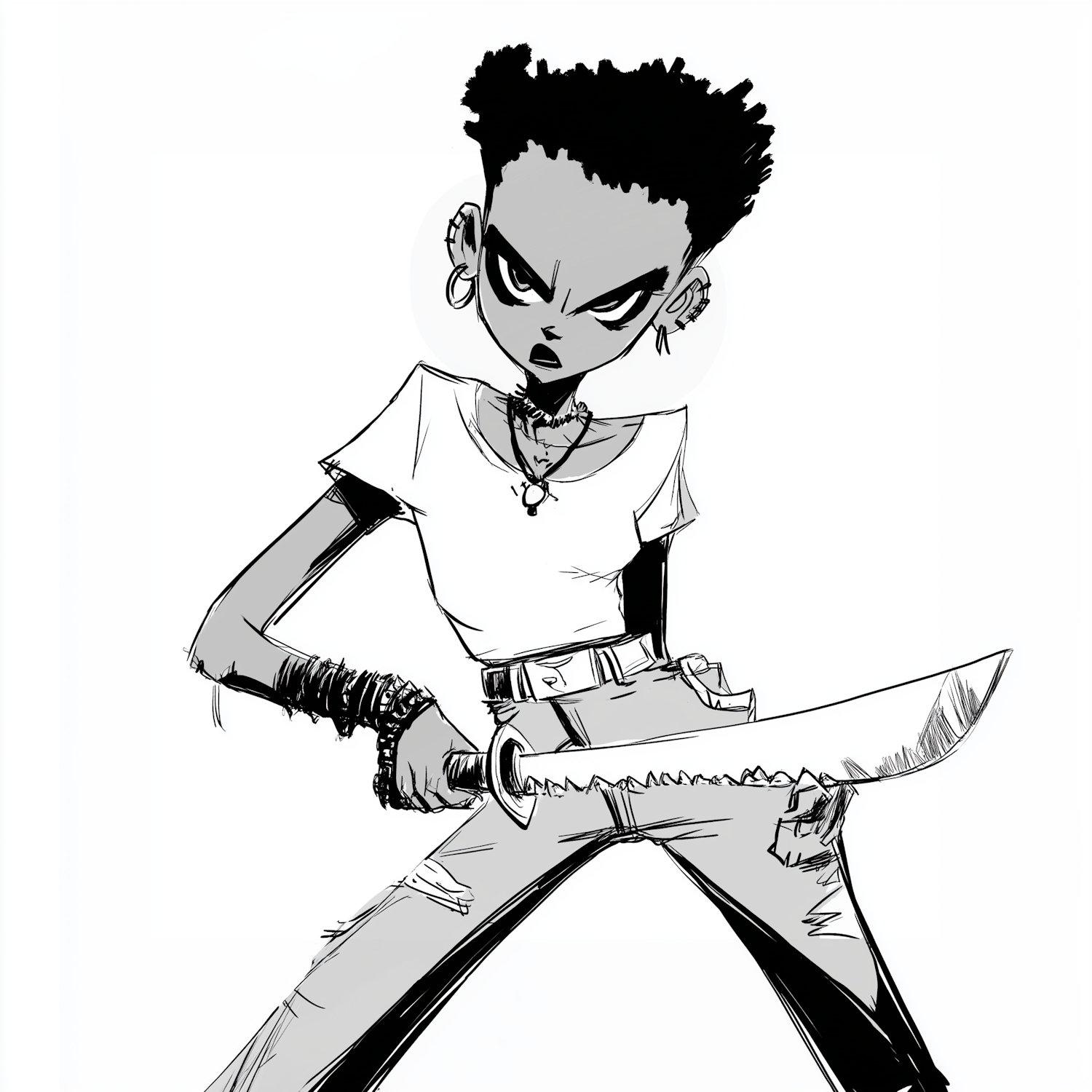 Stylized illustration of a fierce character with a serrated sword, dark skin, spiky hair, and edgy attire in monochrome style.