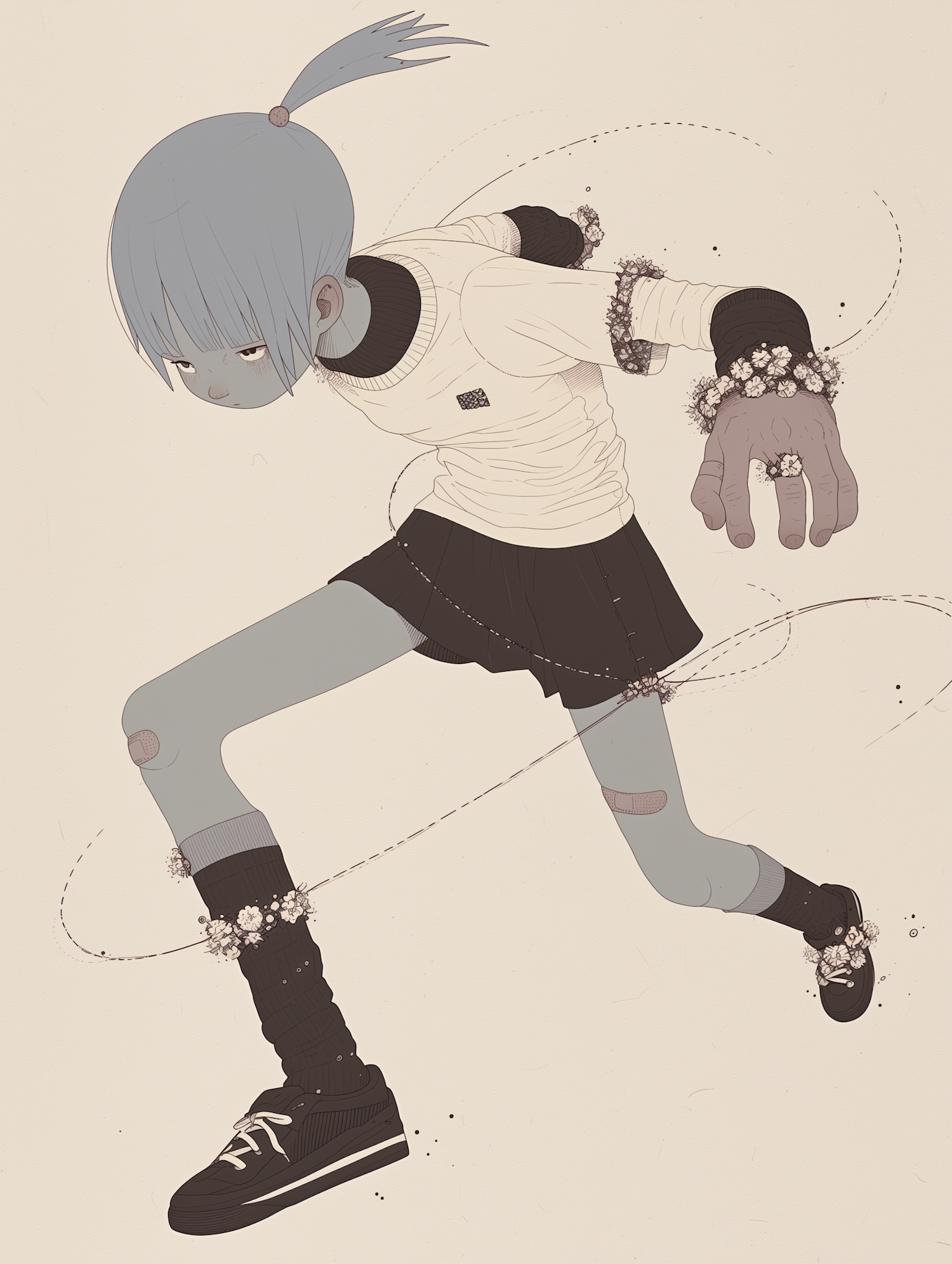 Stylized illustration of a blue-skinned character in motion, adorned with flowers, wearing a white shirt and black skirt.