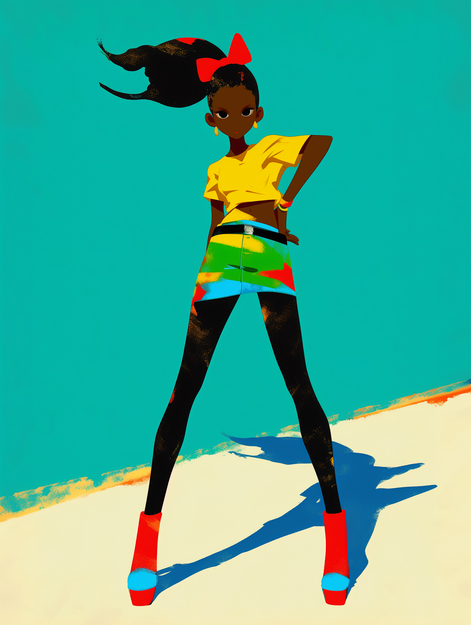 Stylized illustration of a confident girl in vibrant colors, featuring a yellow top, colorful skirt, and red platform shoes.