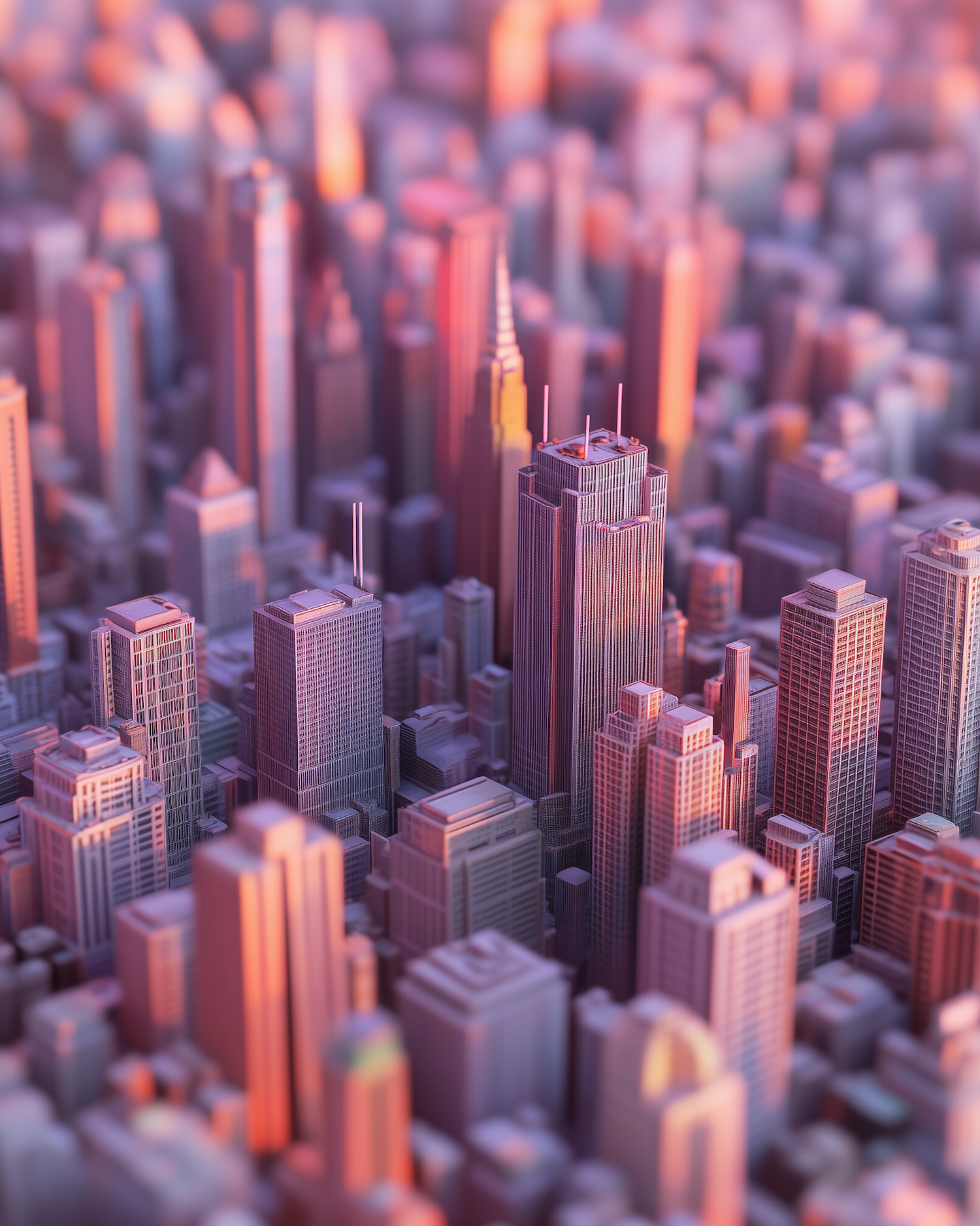 Stylized 3D cityscape with skyscrapers glowing in warm sunset hues, showcasing intricate urban architecture and depth.