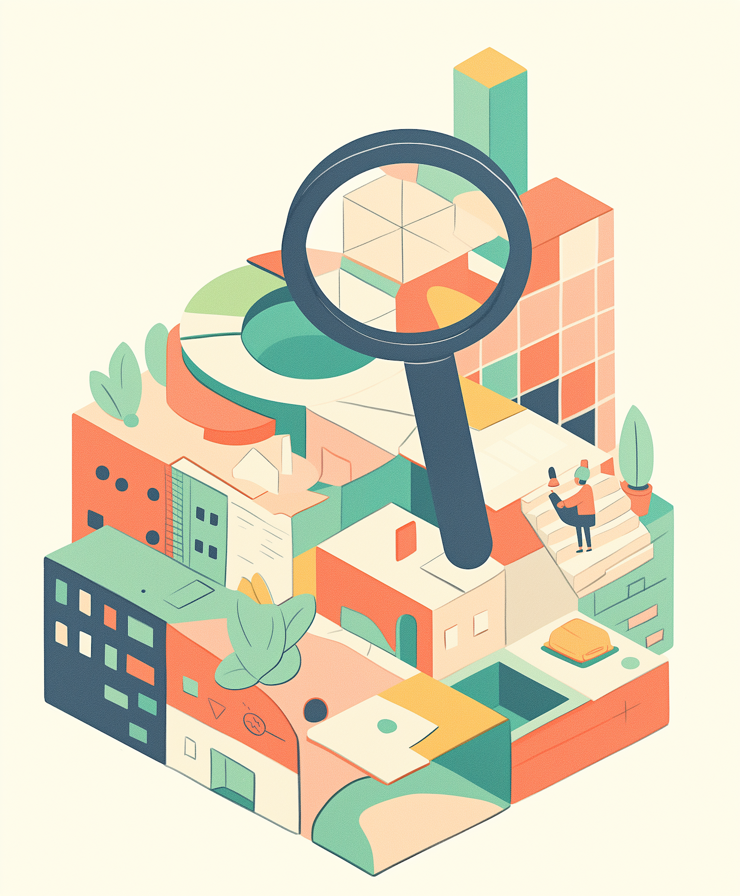 Abstract cityscape illustration with a magnifying glass, geometric buildings, and pastel colors. A figure sits on stairs, adding a human touch.