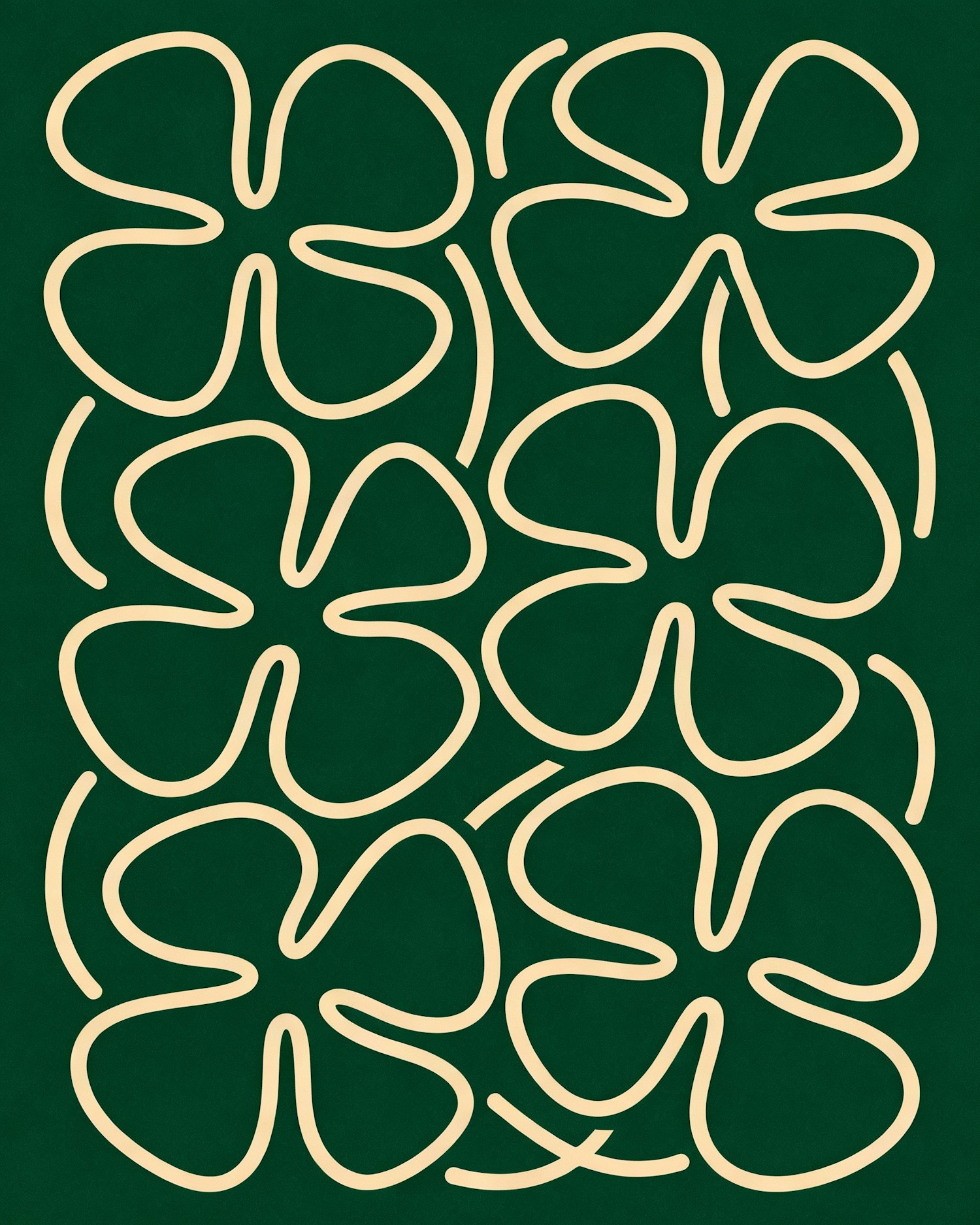 Stylized four-leaf clovers in beige on a green background, arranged in a modern, minimalistic pattern.