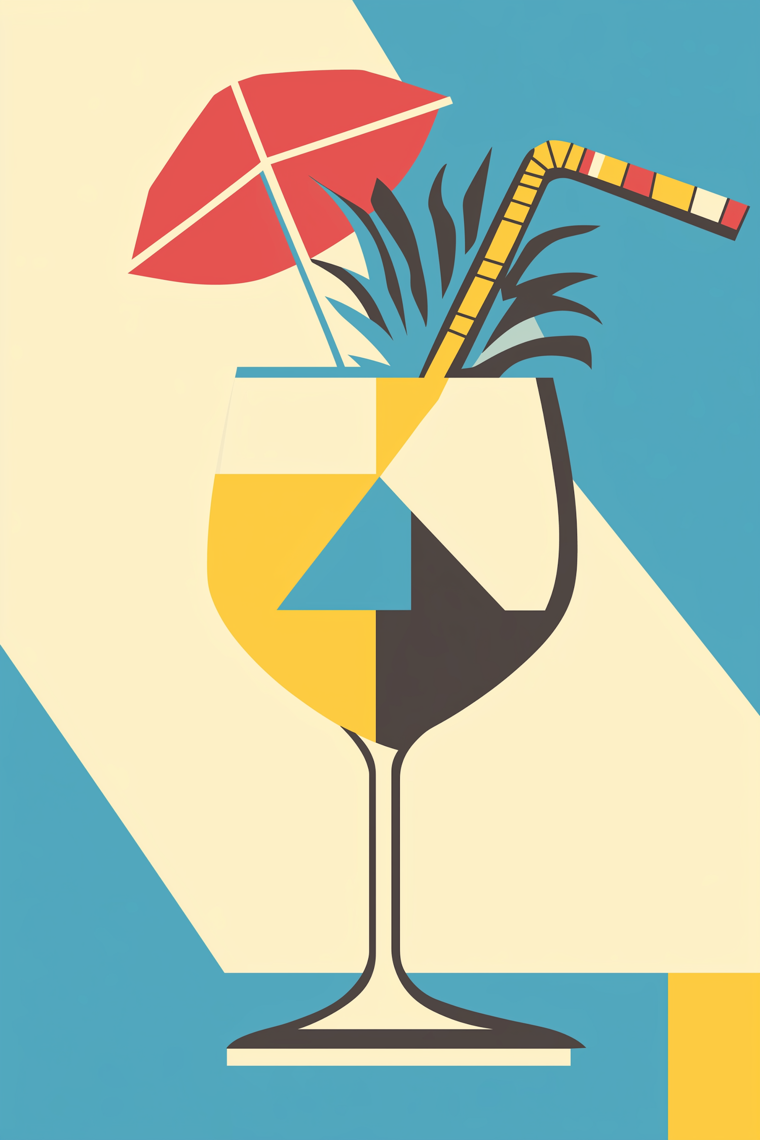 Abstract illustration of a cocktail glass with a red umbrella, striped straw, and tropical leaves on a geometric background.