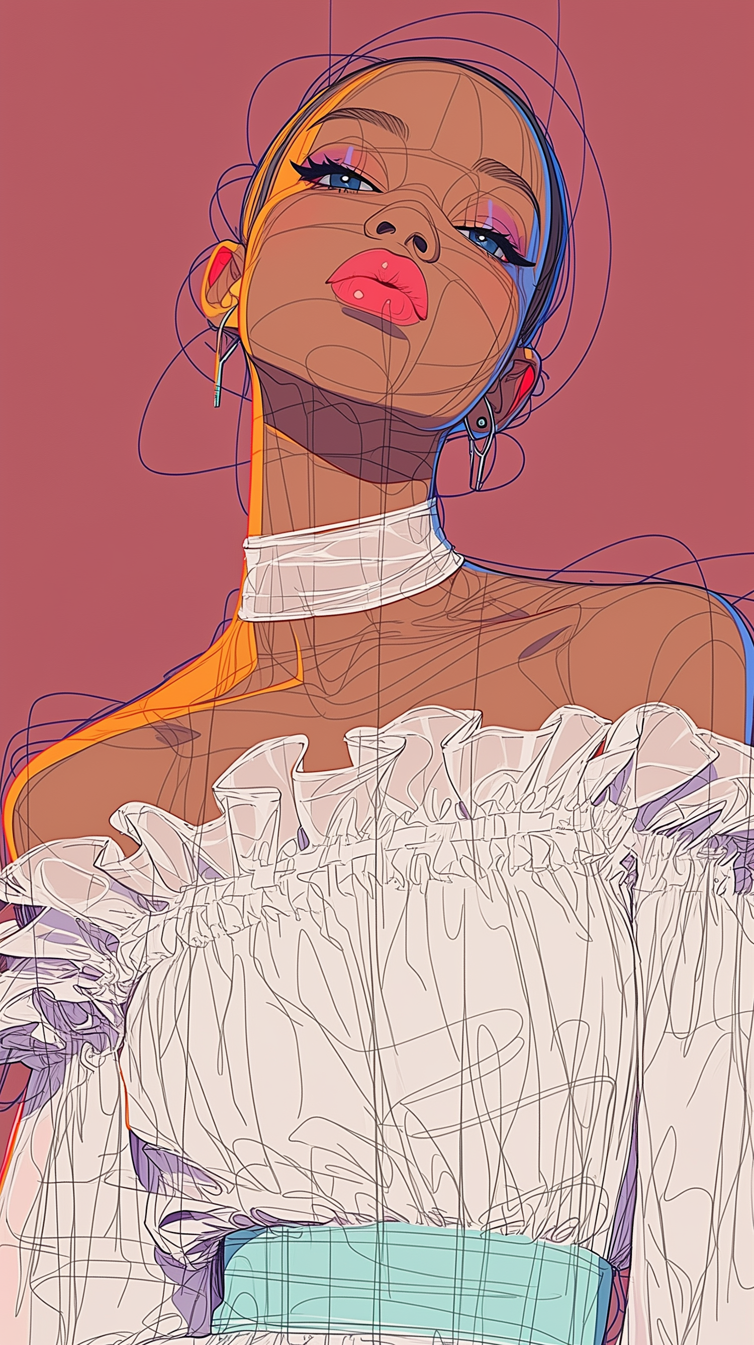 Stylized illustration of a person in a white ruffled top with a pink background, showcasing bold colors and dynamic linework.